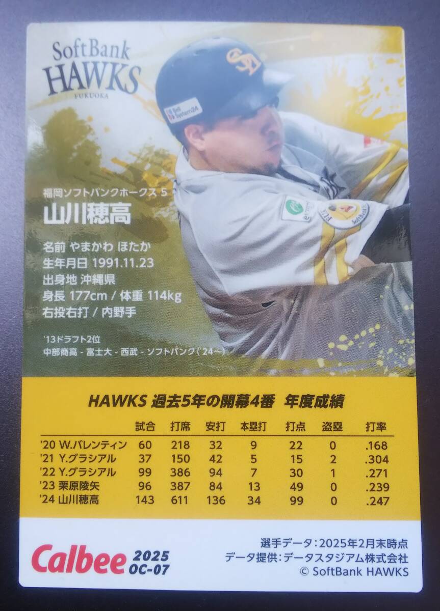 カルビー プロ野球チップス 2025 第2弾 開幕4番カード OC-07 福岡ソフトバンクホークス 山川穂高