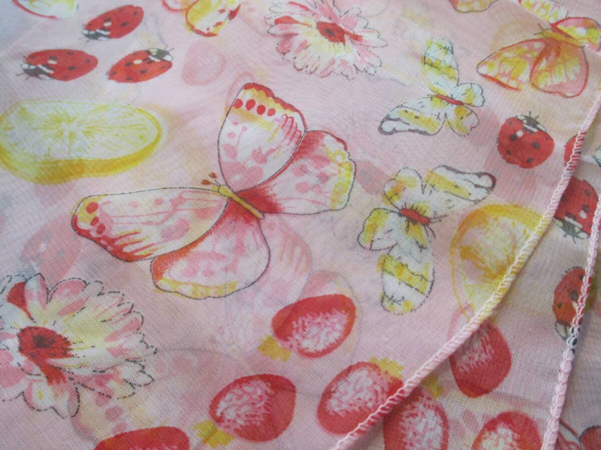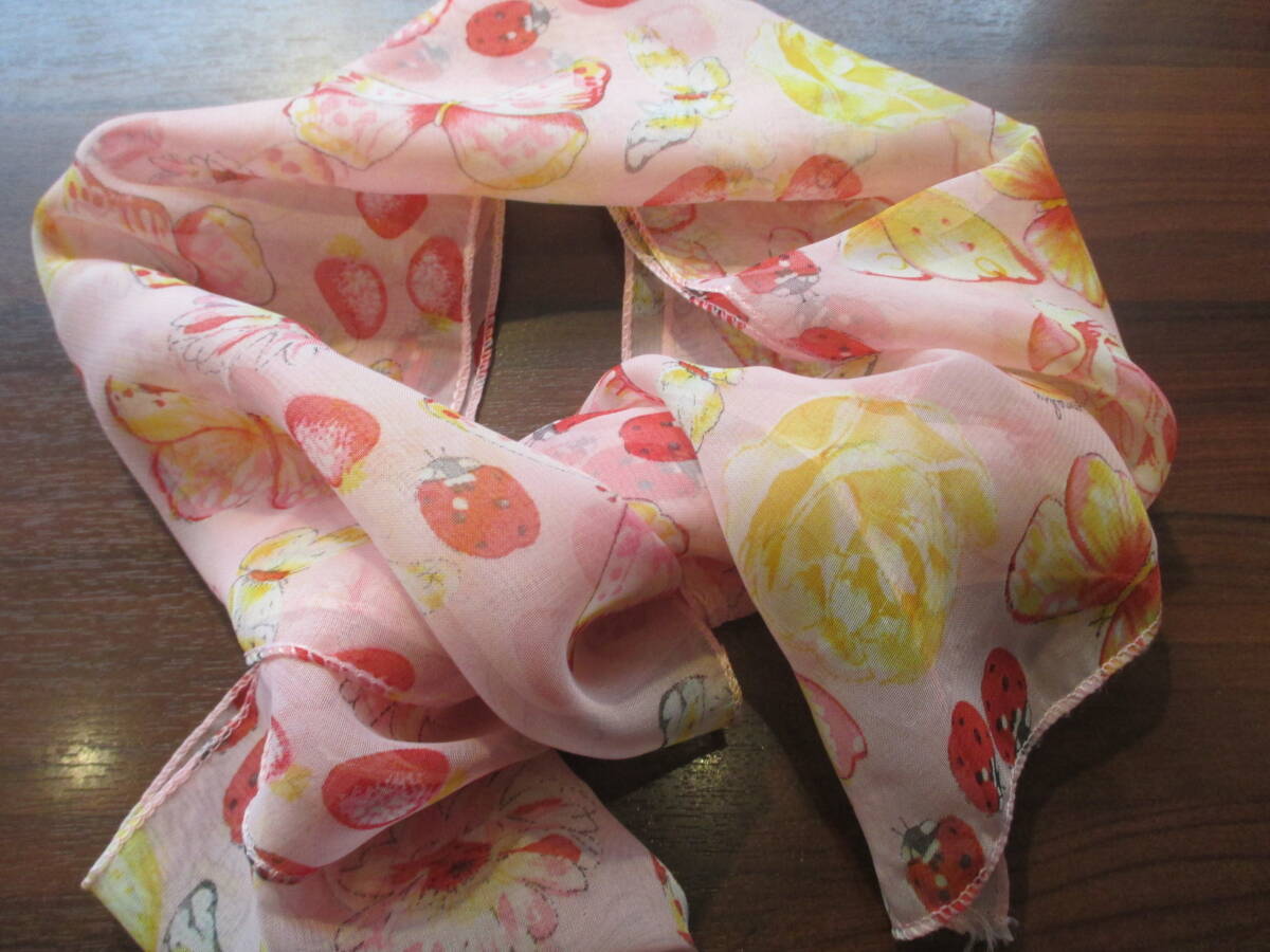 ☆ヨーロッパ輸入スカーフ  ちょうちょ イチゴ テントウムシ レモン フルーツ柄  約20cm×173cm