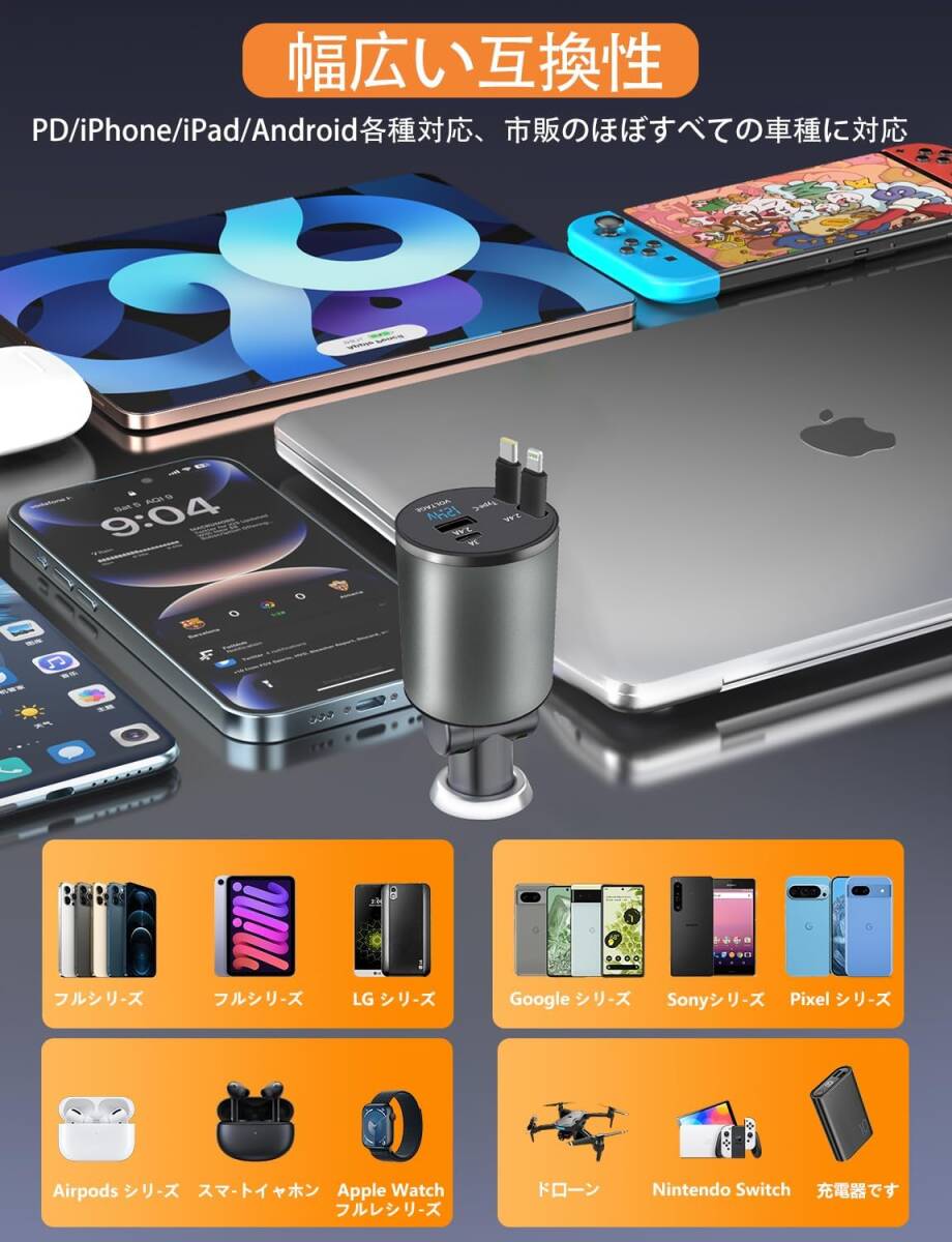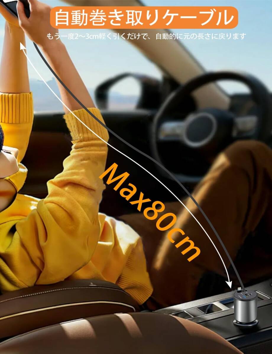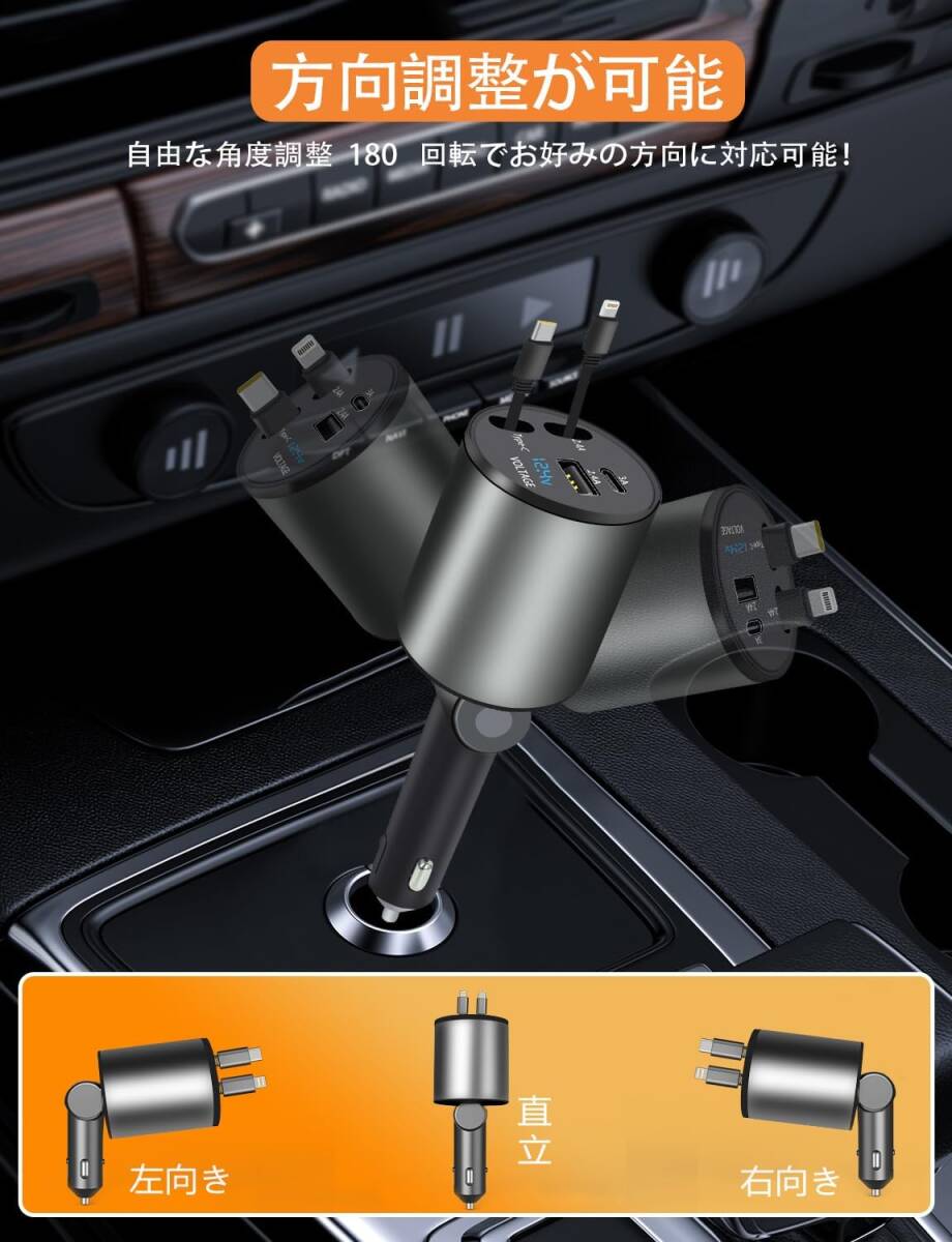 • 【巻き取り式デザイン・Type-C&Lightningケーブル内蔵】 1本のType-Cと1本のLightningケーブルを本体に内蔵し、最大約80cmまで引き出して使用可能。使い終わった後は自動で巻き取り、コードの絡まりを防止。車内をすっきりと整え、シガーソケット周辺の収納性も向上。車用の便利グッズとして、スマートな車内空間づくりに役立ちます。