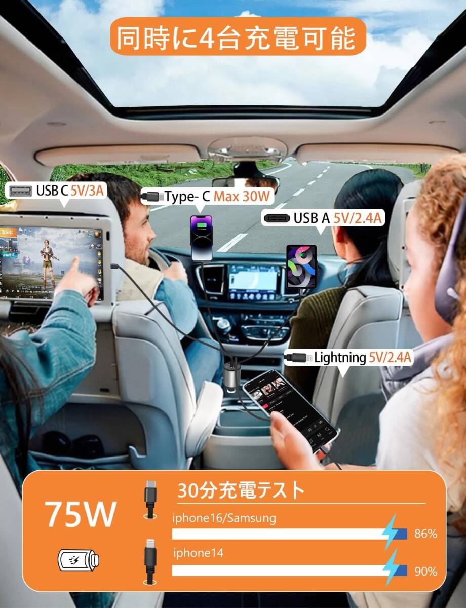 • 【4台同時充電可能&USBポート搭載】 iPhone、Android、iPadなど最大4台のデバイスを同時に充電可能。USBポート×2に加え、Type-C&Lightning内蔵ケーブルでスマホ、タブレット、カーナビなどを一括で給電でき、長距離移動や家族でのドライブにも最適。ハイエースやキャンピングカーなど、複数人が乗る車にもぴったりです。