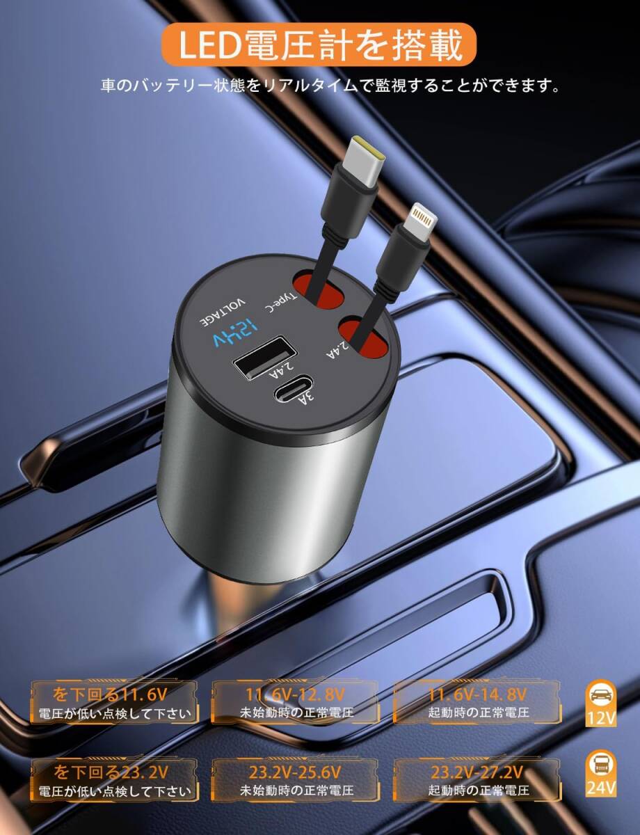 巻き取り式・USB-C&Lightning シガーソケット 車 充電器 巻き取り式充電ケーブル