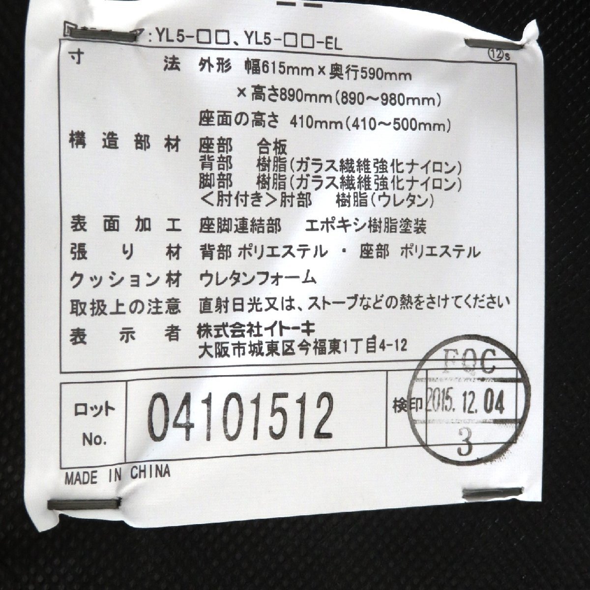 | 機 能 | 2015年製、上下可動肘、上下昇降、リクライニング強度調整・固定、ランバーサポート |