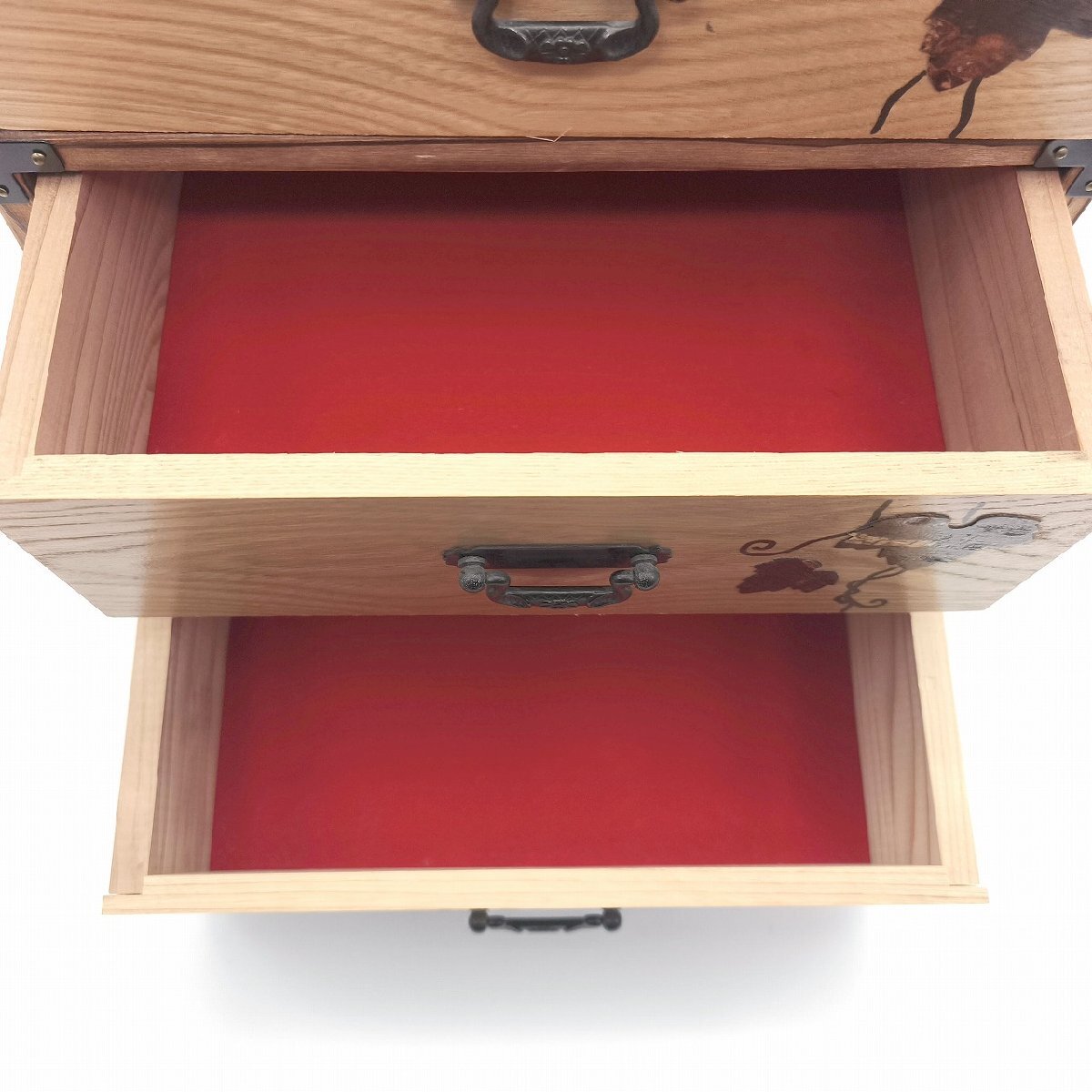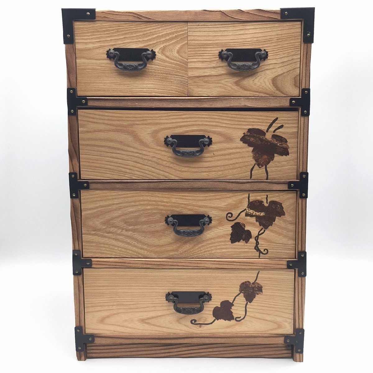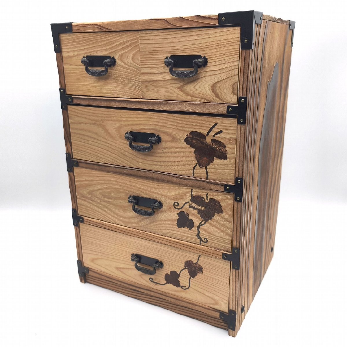 サイズ(幅×奥行×高さ):約242×200×358㎜、外箱なし、状態ランク:C 正面に桜皮の装飾が施された小箪笥です。若干の小キズやヨゴレが見受けられます。その他状態は画像をご確認ください。
