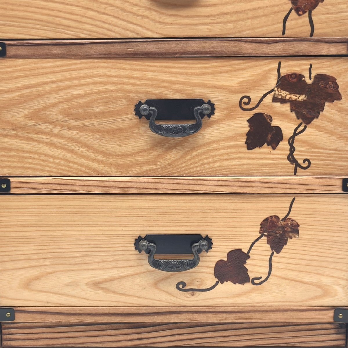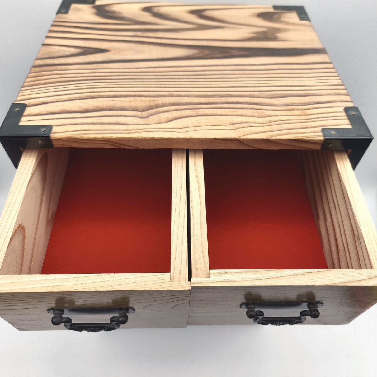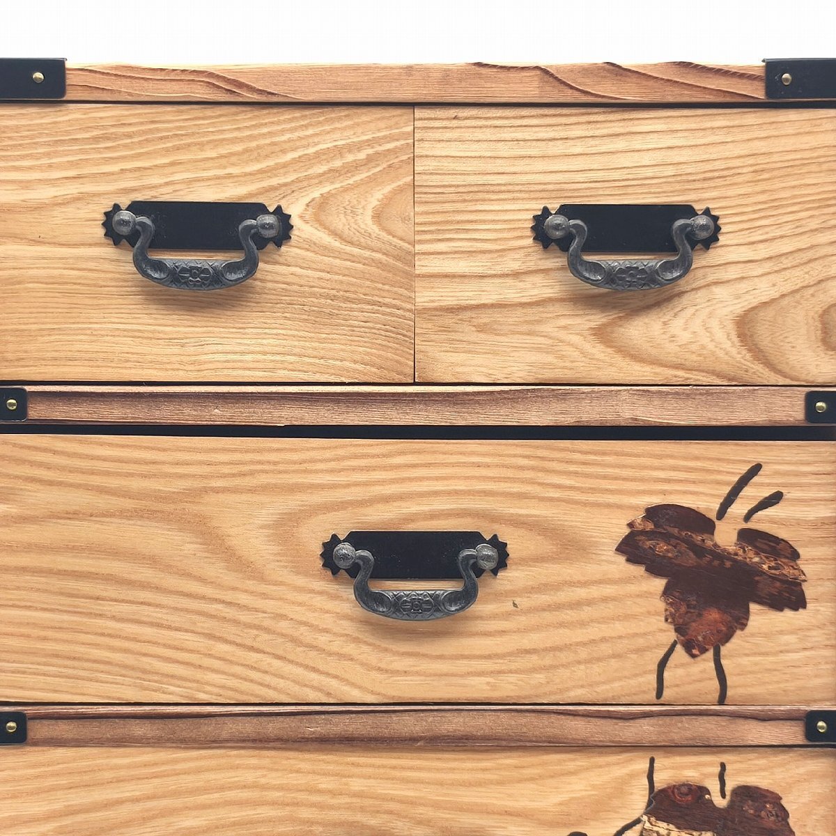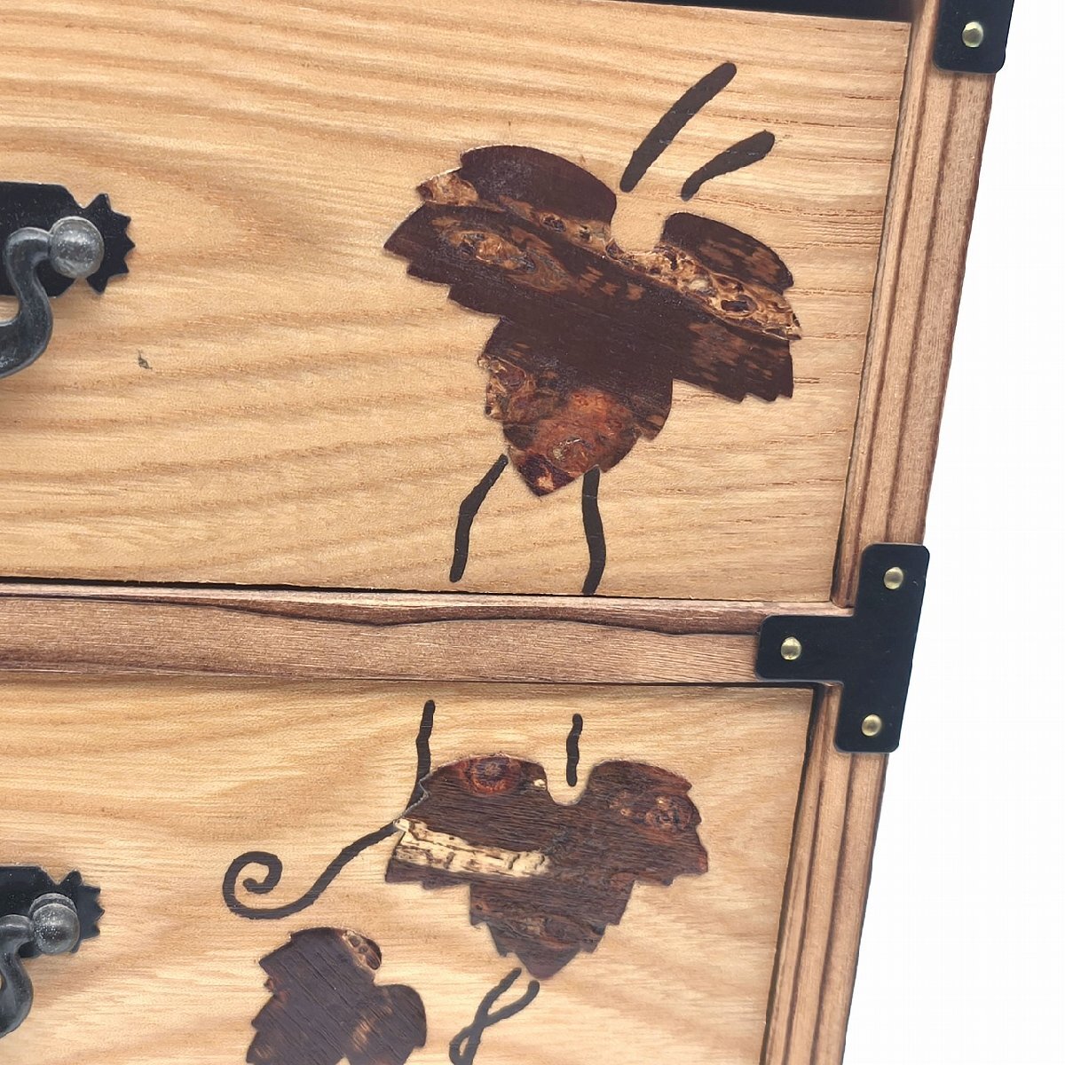 サイズ(幅×奥行×高さ):約242×200×358㎜、外箱なし、状態ランク:C 正面に桜皮の装飾が施された小箪笥です。若干の小キズやヨゴレが見受けられます。その他状態は画像をご確認ください。