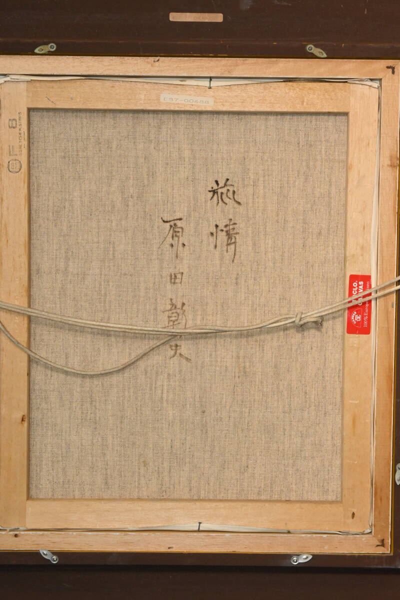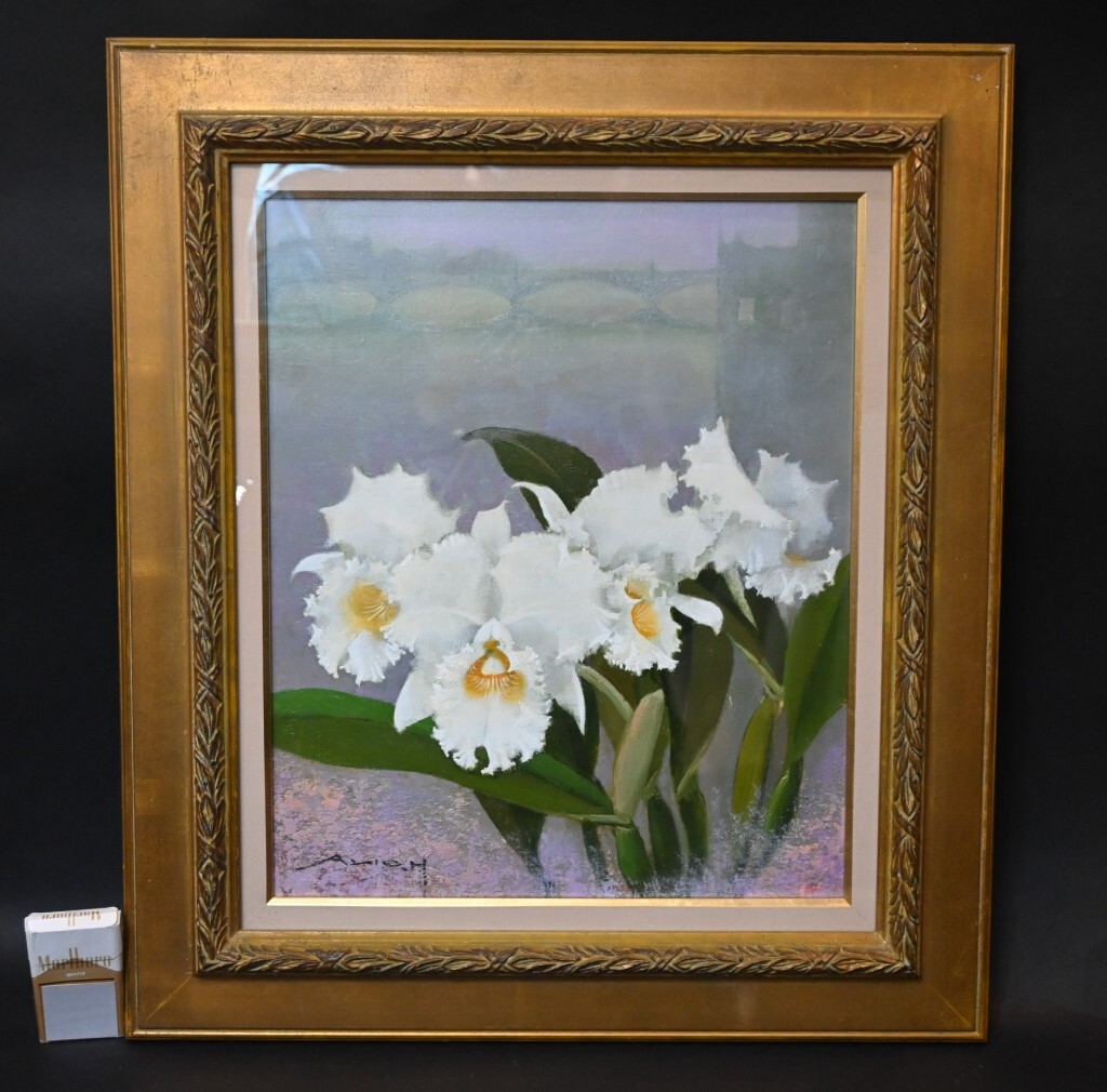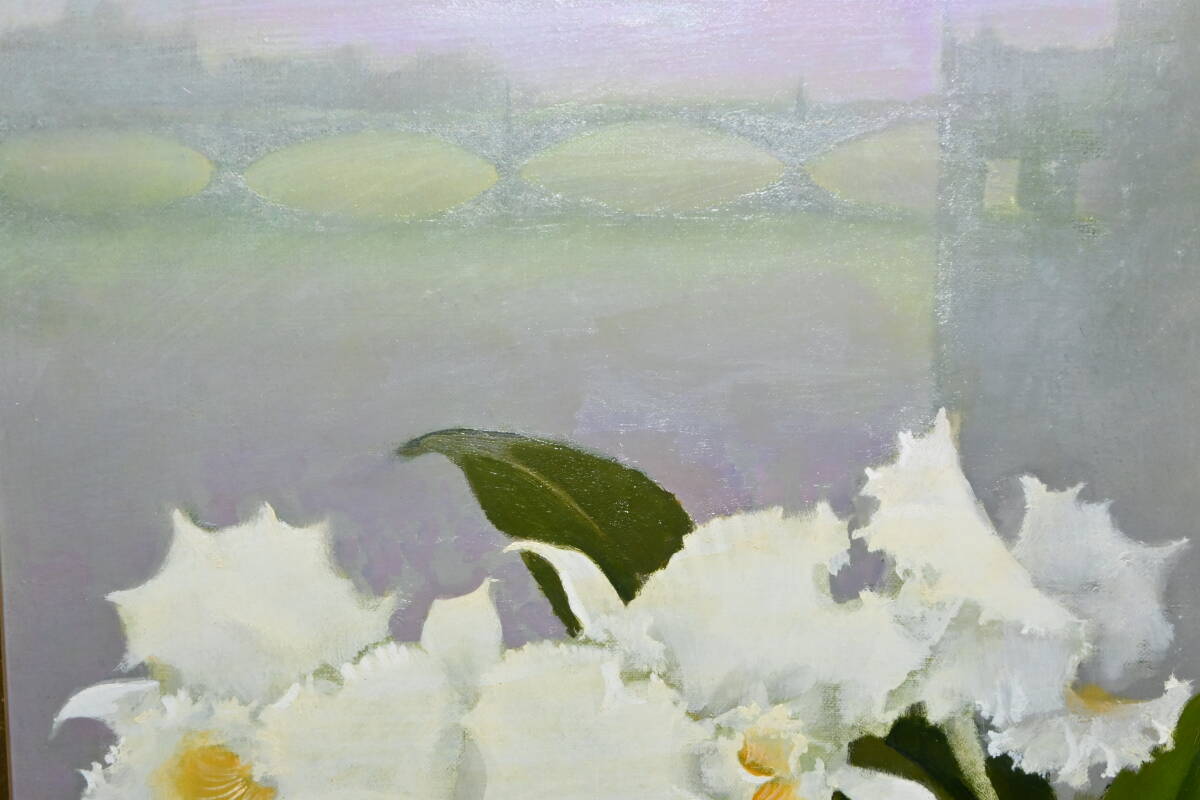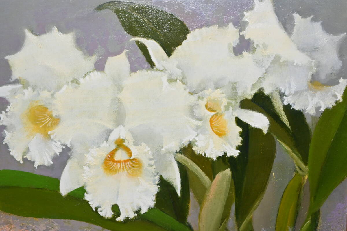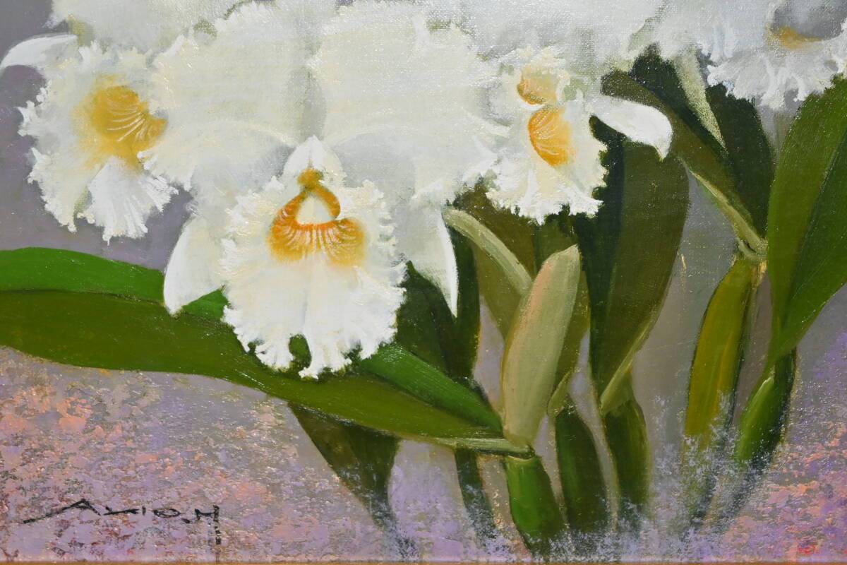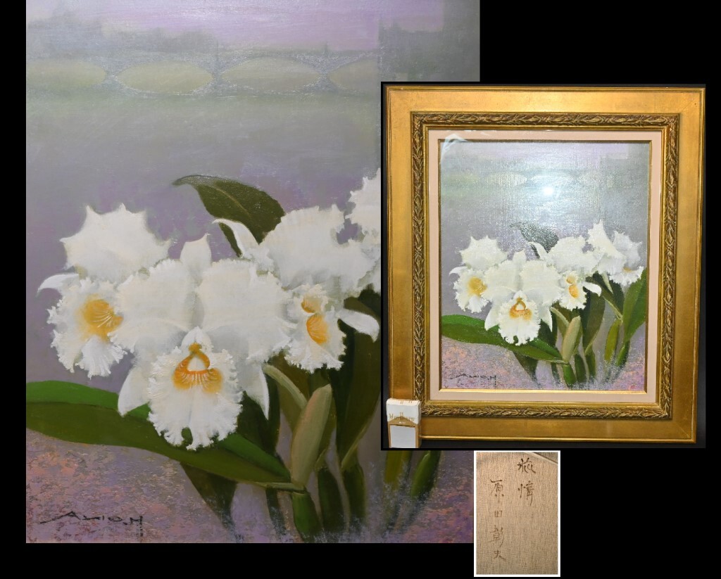 真贋保証■原田彰夫■ 油彩『旅情』F8号 洋蘭 カトレア サイン有 額装 風景と花の絵 愛知県生 ル・サロン展銅賞 リアリズム | |||||||||||||