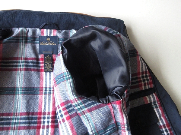 ブルックブラザーズのジャケット。高密度のコットンナイロン生地を使用しております。フロントはダブルジップ。レザーのトリムやチェックの裏地使いなど、細部にまで凝った作りになっております。上質な素材使いと綺麗なシルエットで、様々なコーディネートにお使い頂ける一着です。