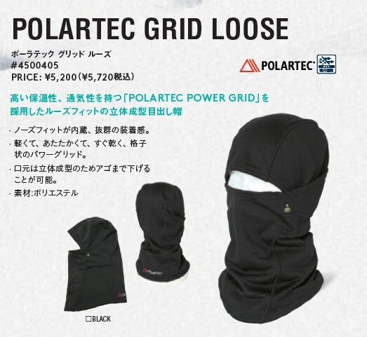 高い保温性、通気性を持つ「POLARTEC POWER GRID」を採用したルーズフィットの立体成型目出し帽