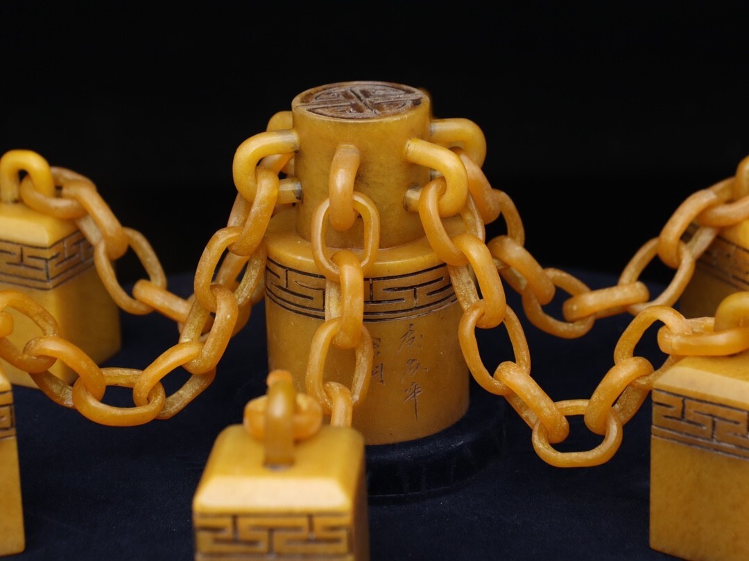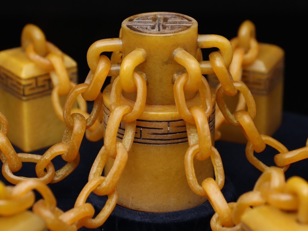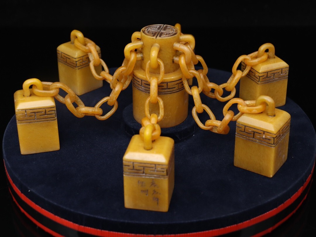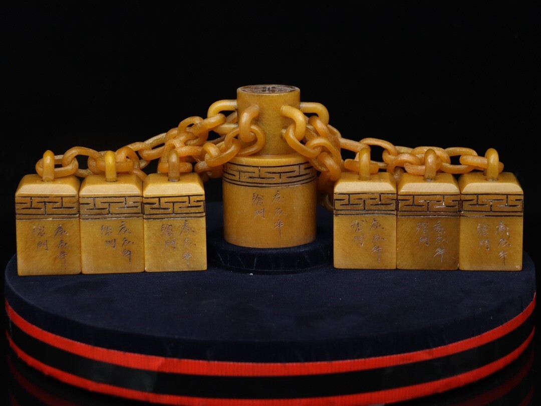 永し 清時代 滄門銘 壽山石 田黄石彫 七鏈印 印章 印鑑 印璽 極細工 置物擺件 古美術品 時代物 古董品 収集 旧家蔵出 中国唐物 866g