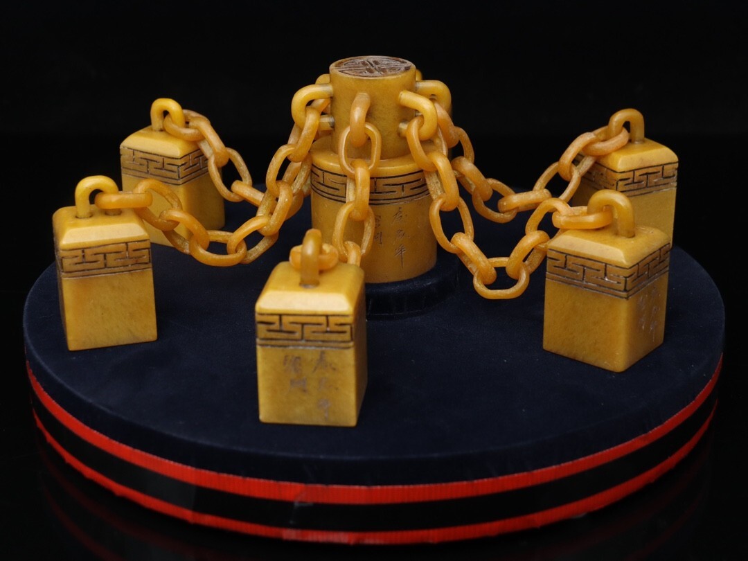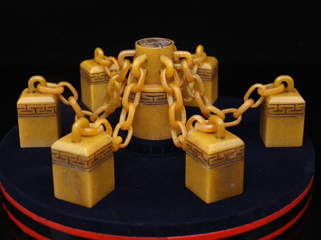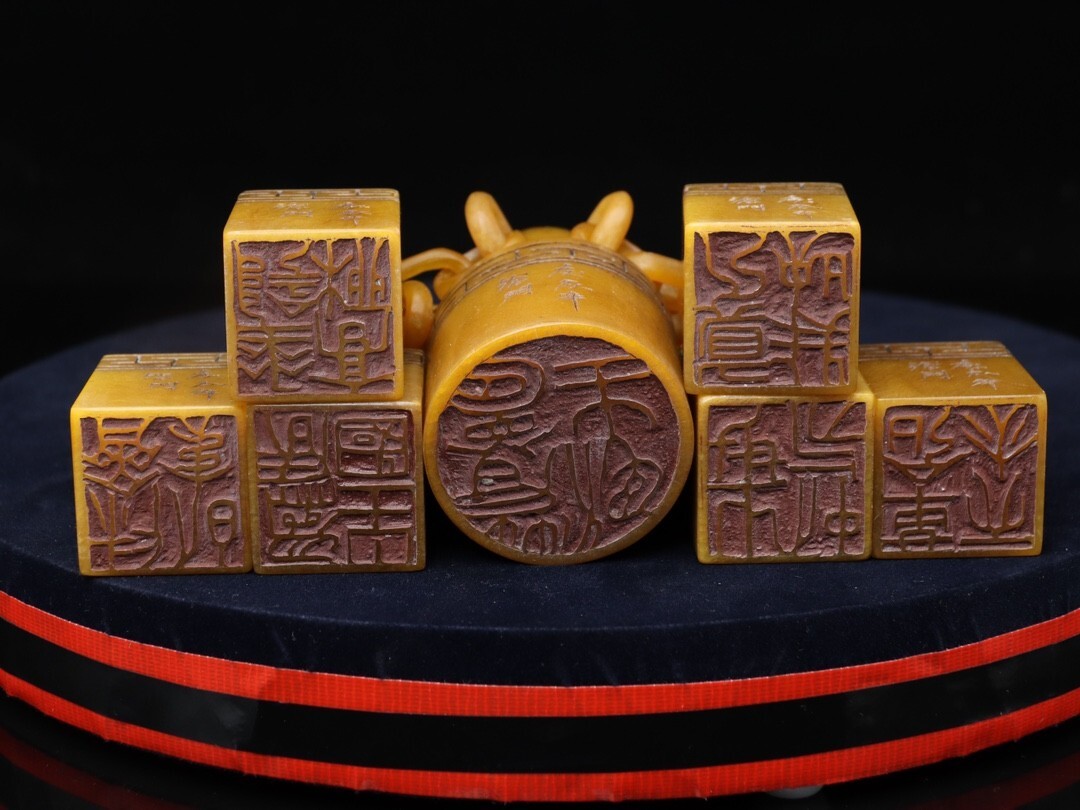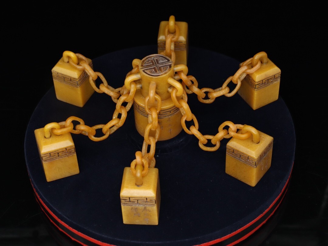 永し 清時代 滄門銘 壽山石 田黄石彫 七鏈印 印章 印鑑 印璽 極細工 置物擺件 古美術品 時代物 古董品 収集 旧家蔵出 中国唐物 866g