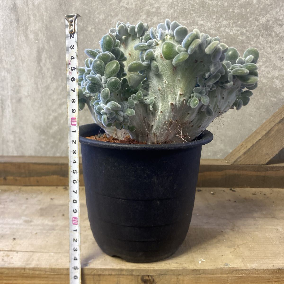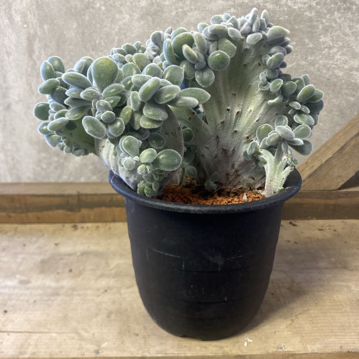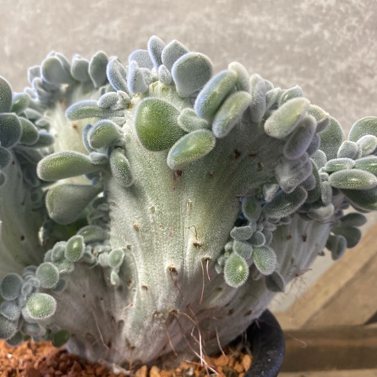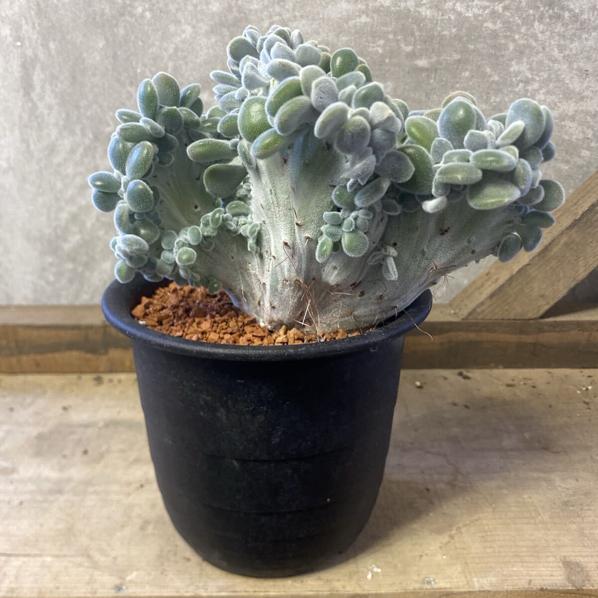 産毛の生えたぷっくりとした多肉質がたまらなく可愛いエケベリア プルビナータの綴化種。