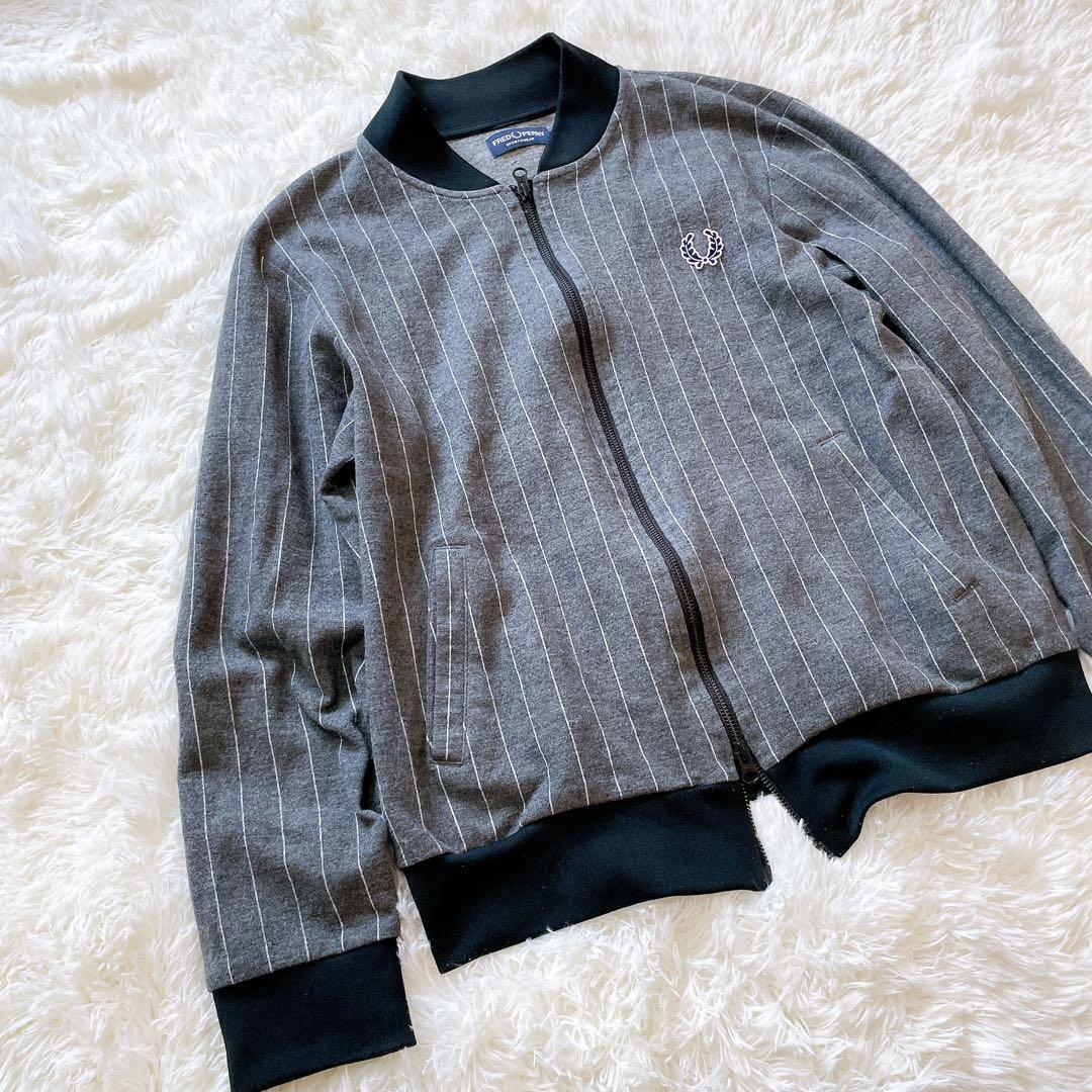 フレッドペリー FREDPERRY トラックジャケット ブルゾン ジャージ スポーツウェア ピンストライプ グレー 月桂樹ロゴ メンズ Lサイズ ジップアップ セットアップ対応 ジャケット 上品 キレイめ 春 秋 冬 美品 正規品