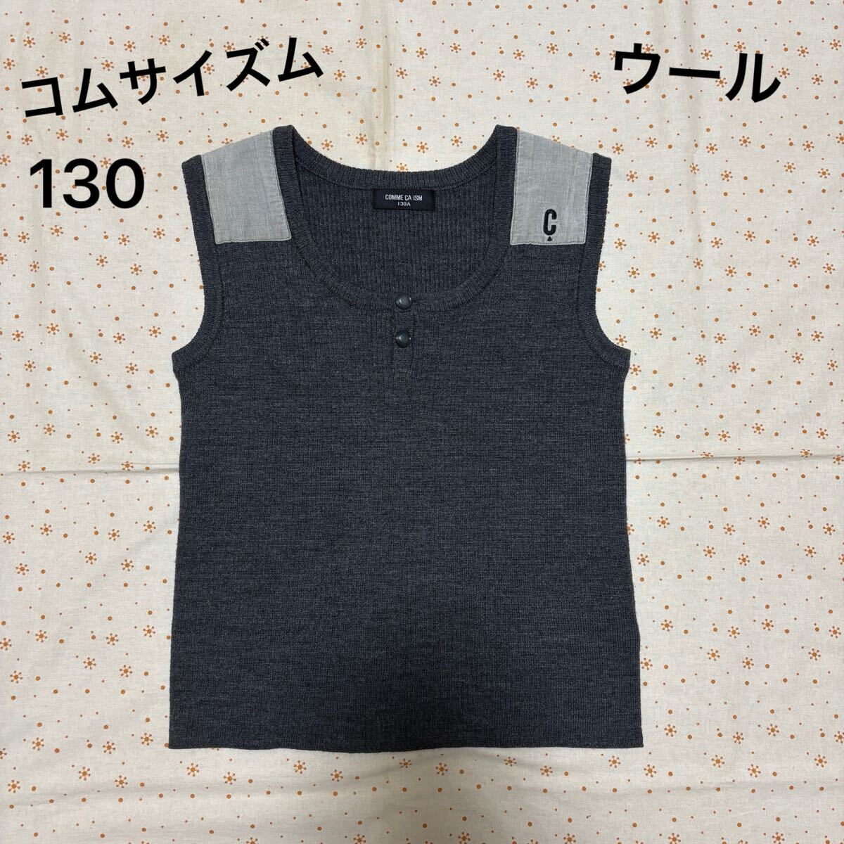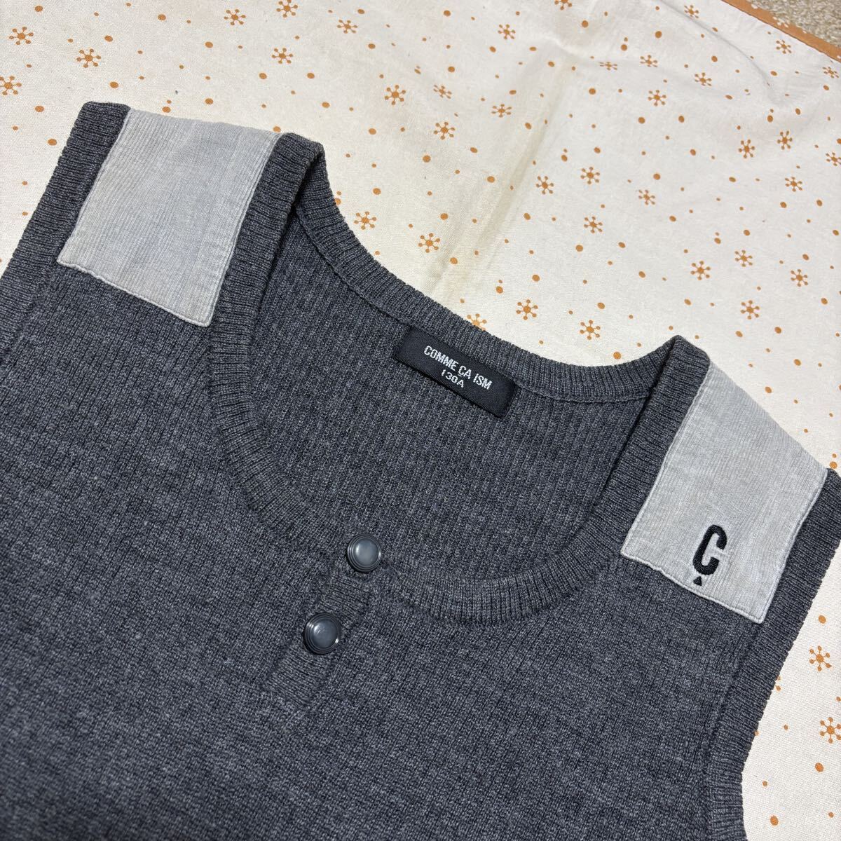リブ編みのグレーのベスト、肩にアクセントあり。