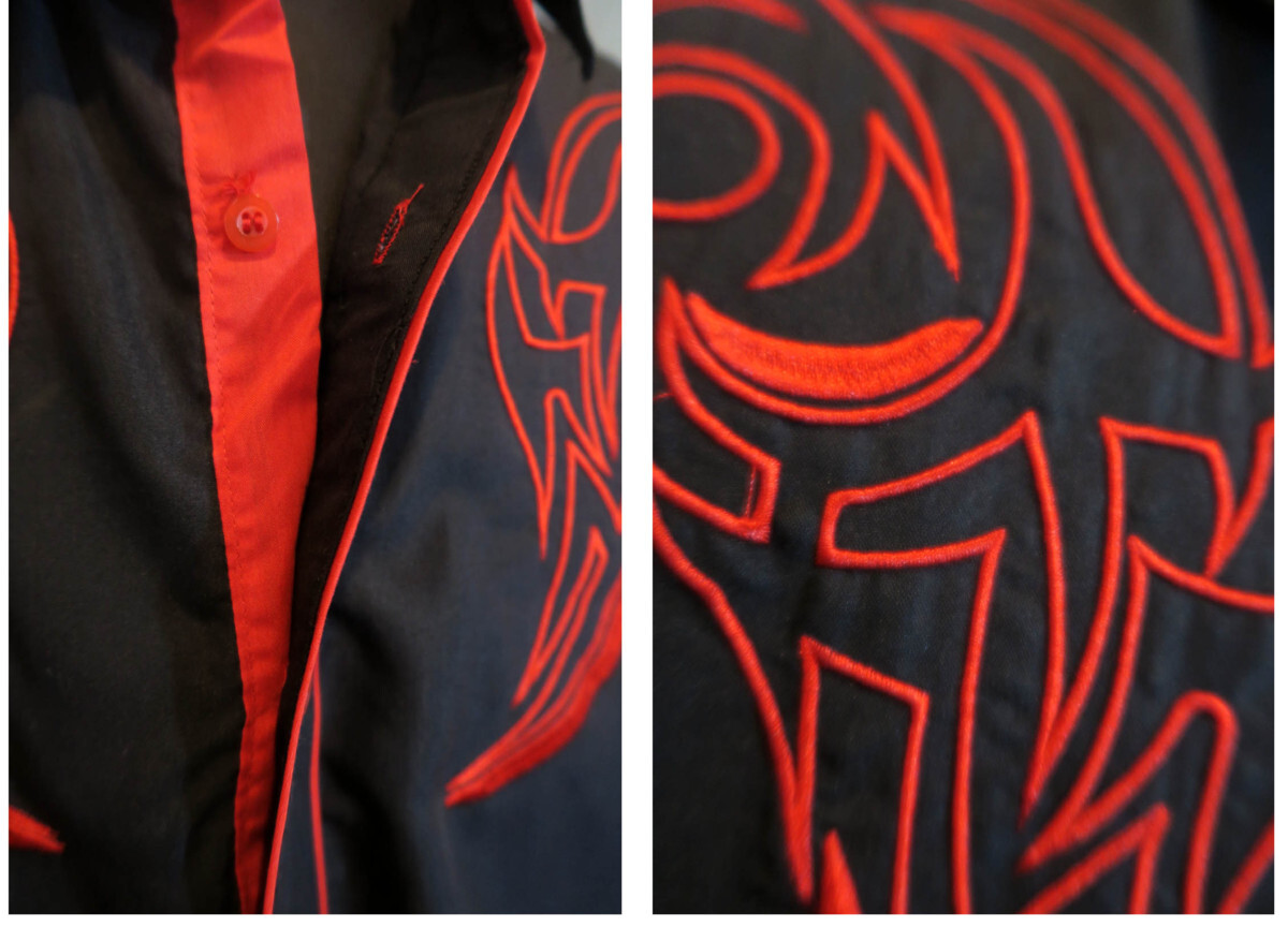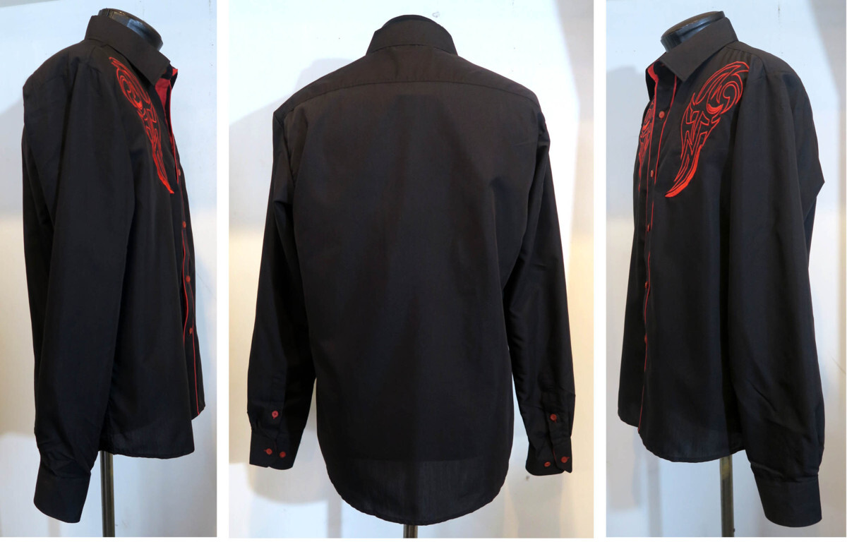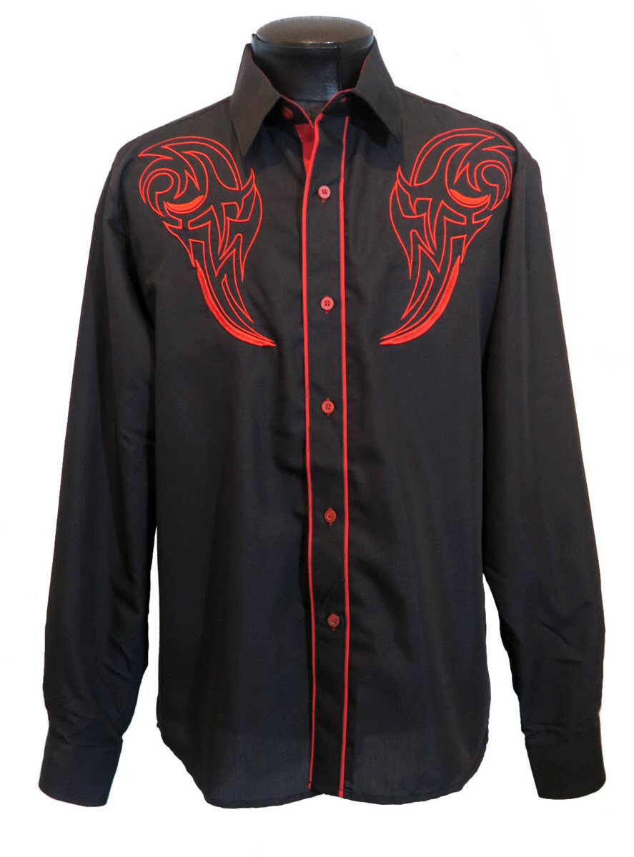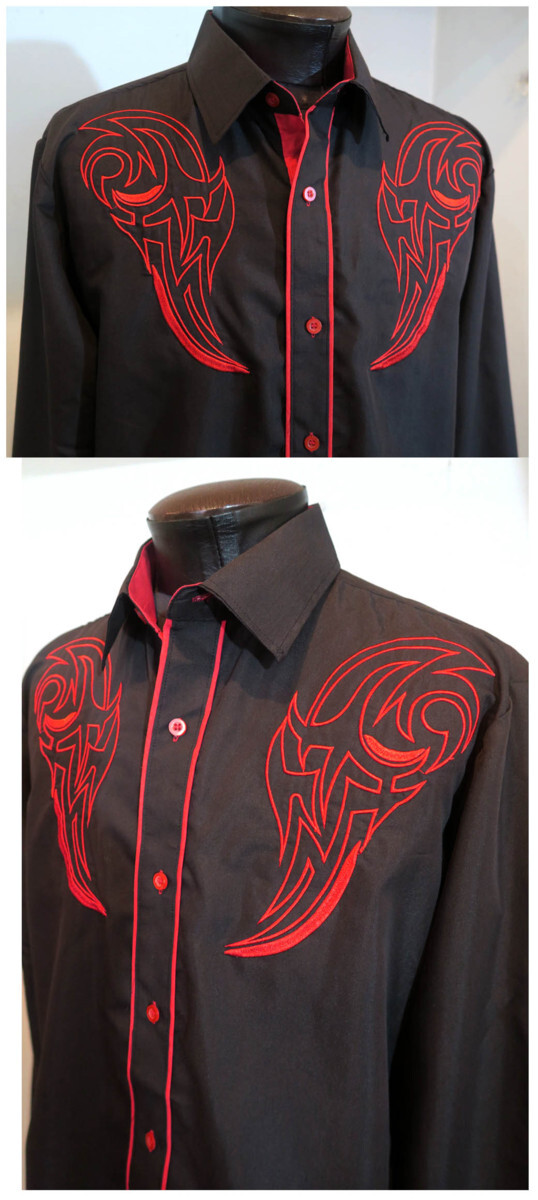 新品 3XLサイズ トライバル 刺繍 シャツ 長袖 赤 黒 1435 メンズ 大きなサイズ カウボーイ ロカビリー タトゥー 柄シャツ ウエスタン