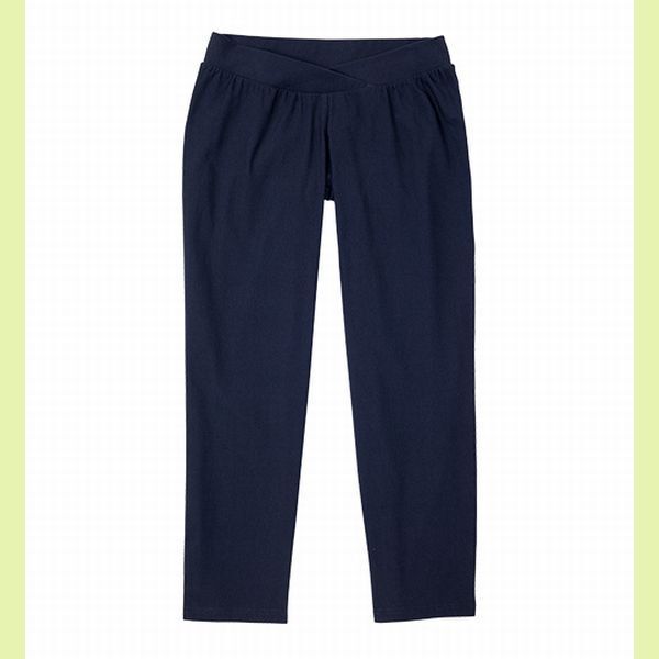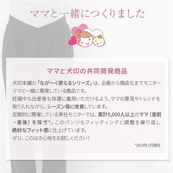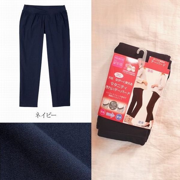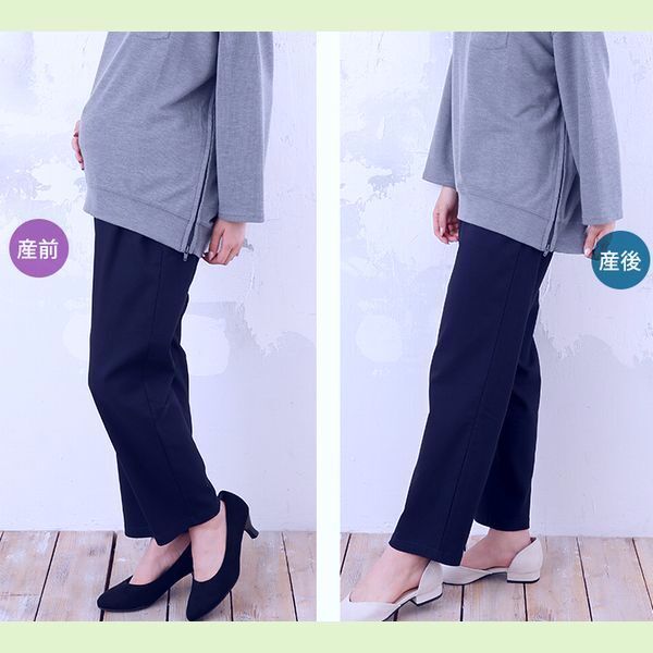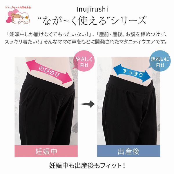 犬印本舗の、産前~産後にわたってながく使えるよく伸びるストレッチ素材のテーパードレギパンです。
