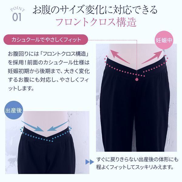 〇お腹のサイズ変化に対応できるフロントクロス構造で、お腹まわりを締め付けず程良くフィット。