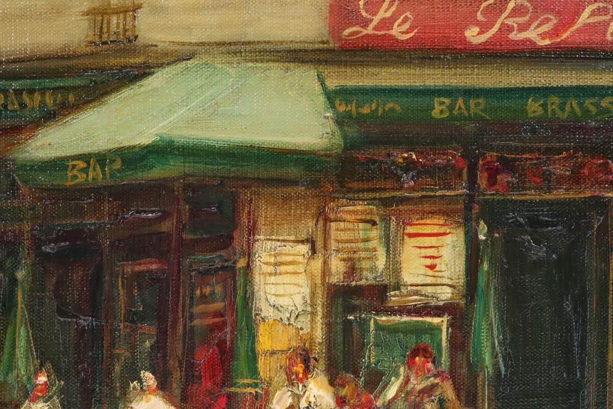 真作 岩見健二 油彩「ベルビルのレストラン」画寸 M4 大阪府出身 兵庫大学短大教授 厚塗りの筆致と温かな色調 パリの建物への深い愛 11654
