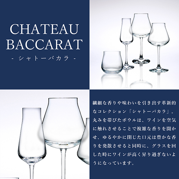 | スタッフコメント | 繊細な香りや味わいを引き出す革新的なコレクション「シャトーバカラ」。丸みを帯びたボウルは、ワインを空気に触れさせることで複雑な香りを開かせ、ゆるやかに閉じた口元は豊かな香りを発散させると同時に、グラスを回した時にワインが高く昇り過ぎないようになっています。 |