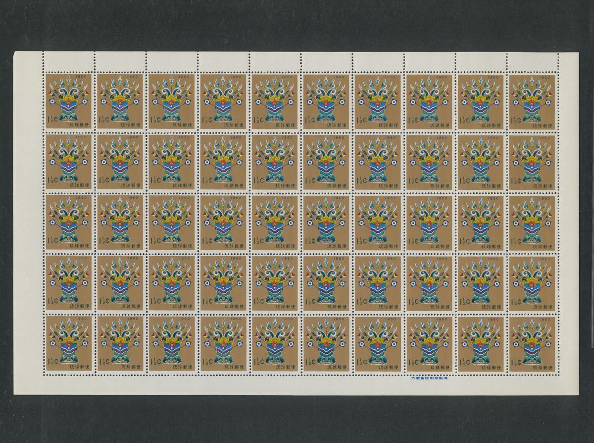 琉球郵便 年賀切手1960年「やかじ」1¢ 50枚シート 未使用 左上角折れ有
