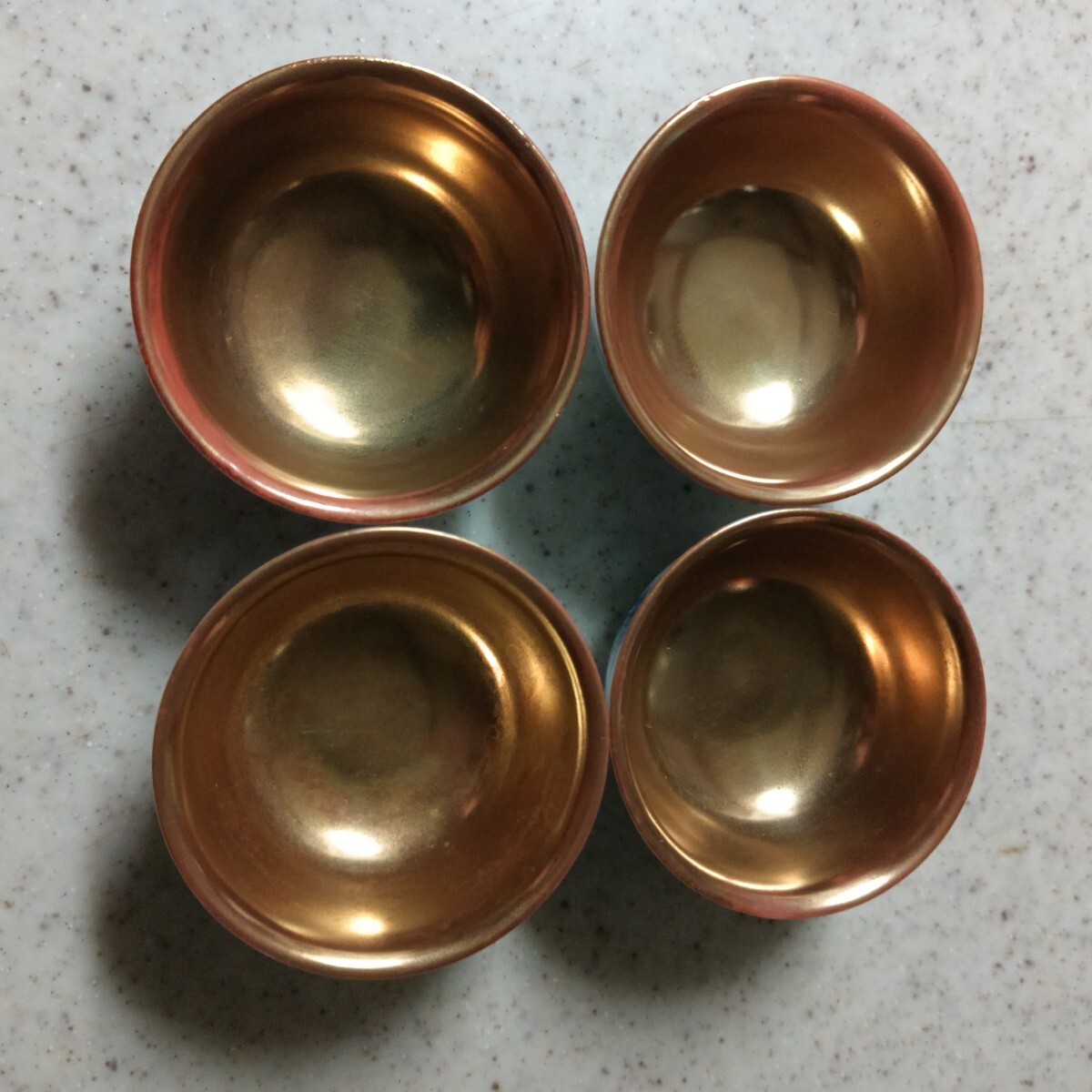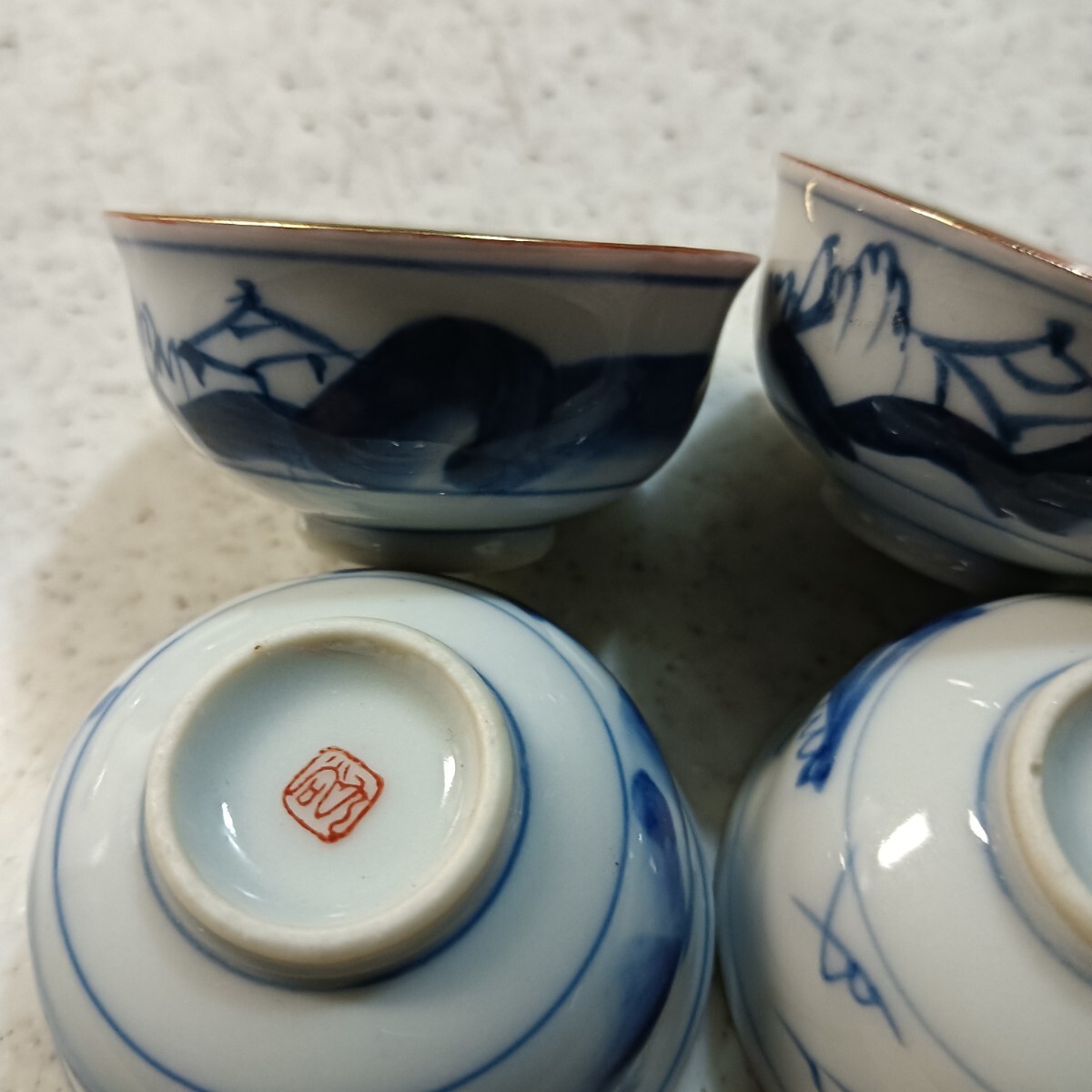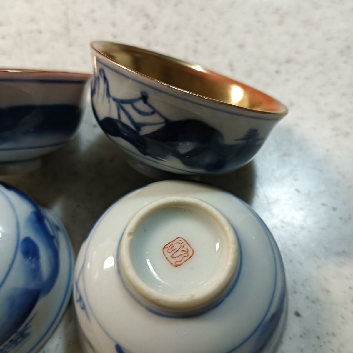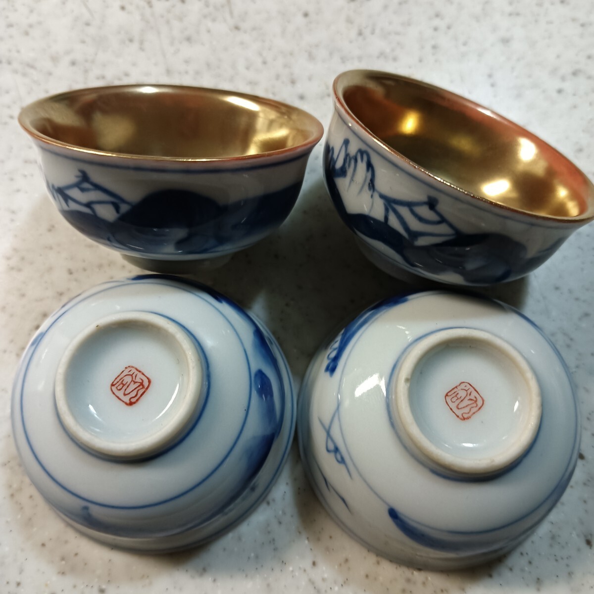 内側が金色、外側に青色の絵柄が施された陶器の盃4個セット。