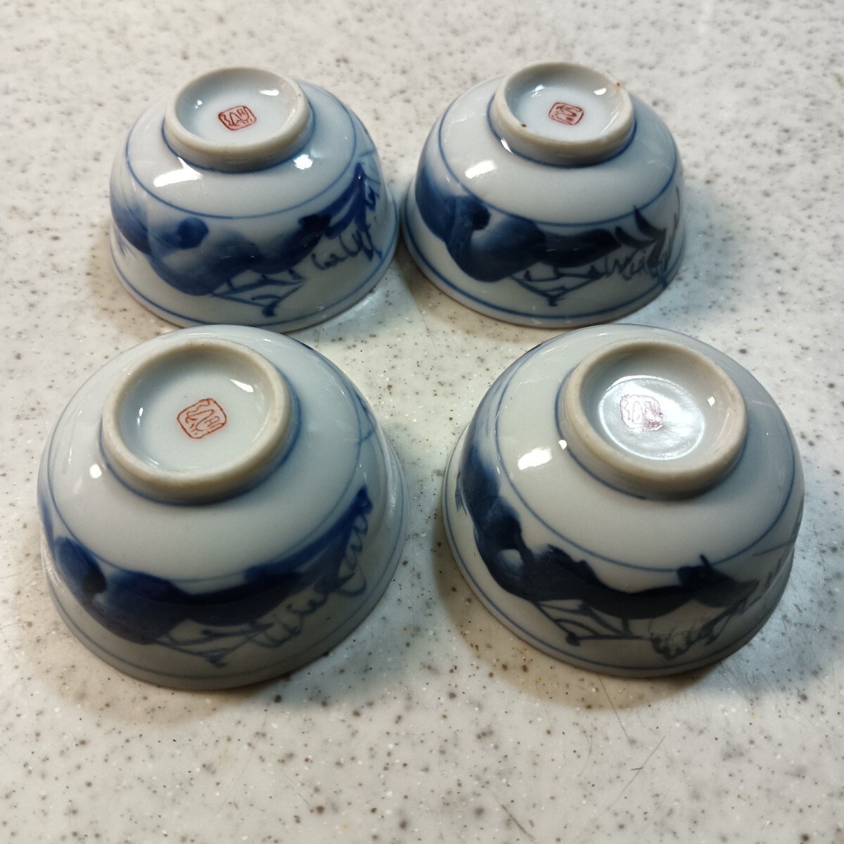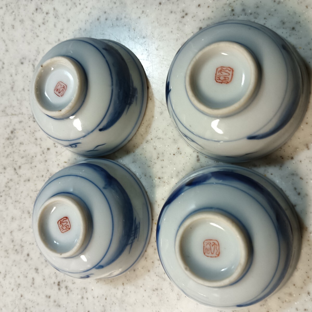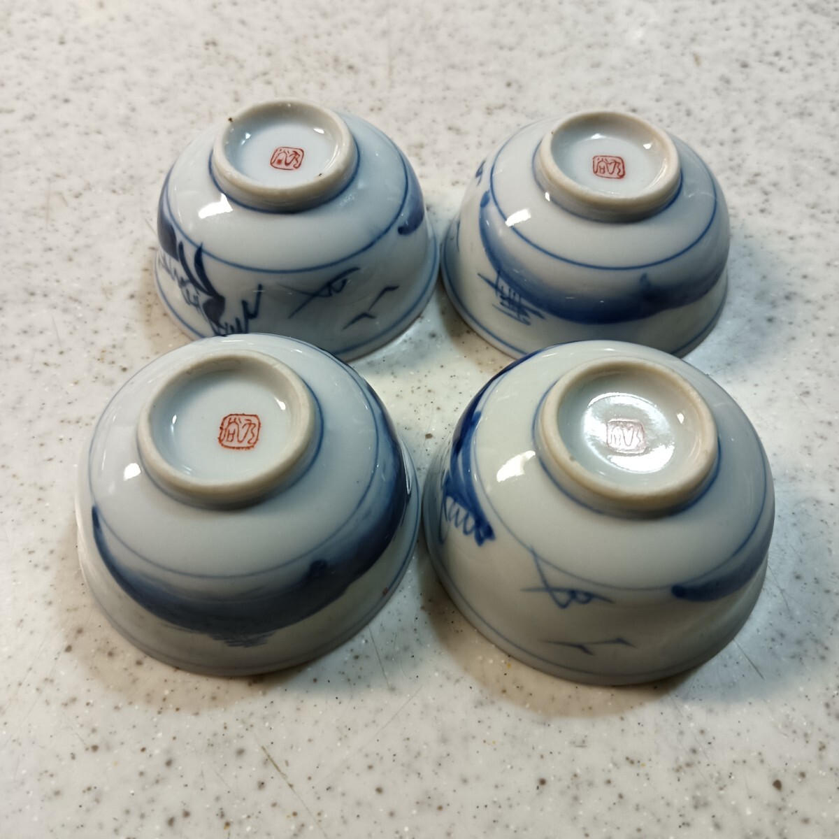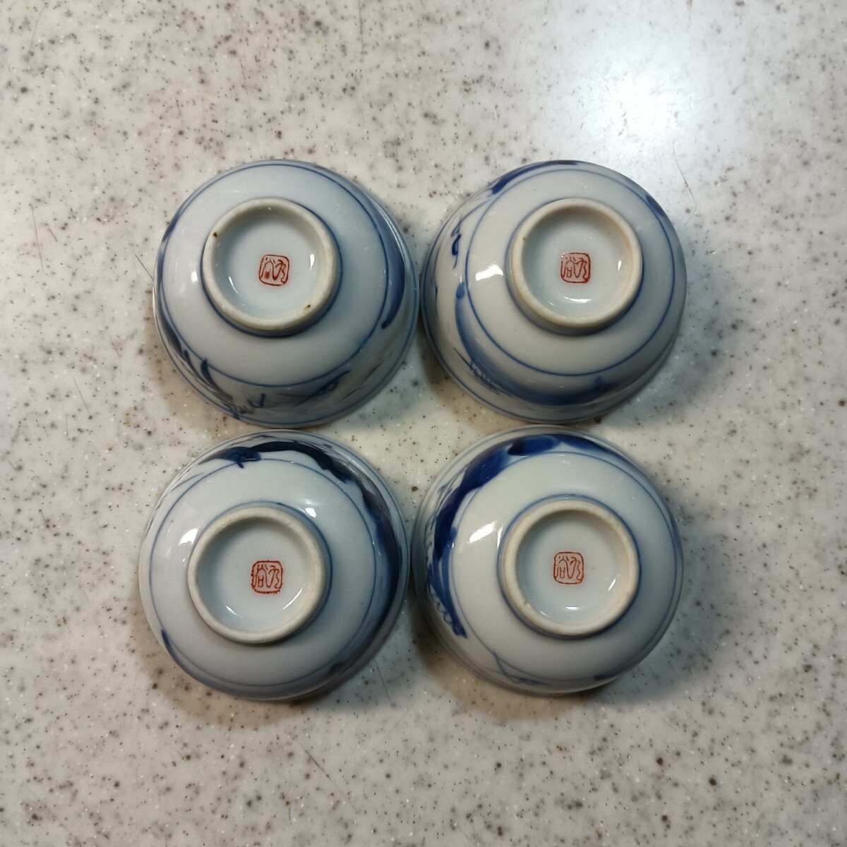 内側が金色、外側に青色の絵柄が施された陶器の盃4個セット。