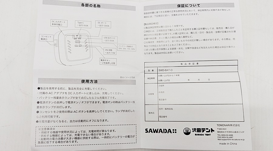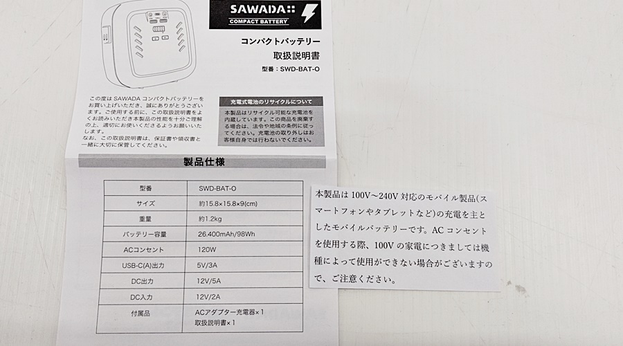 SAWADA コンパクトバッテリー ポータブル電源 SWD-BAT-O 中古 現状品 アウトドア 防災