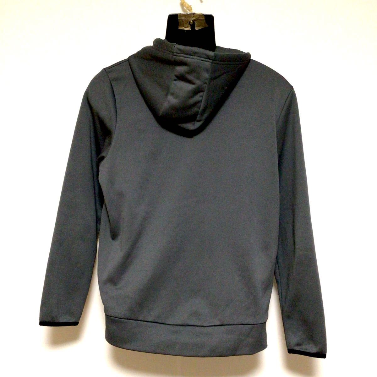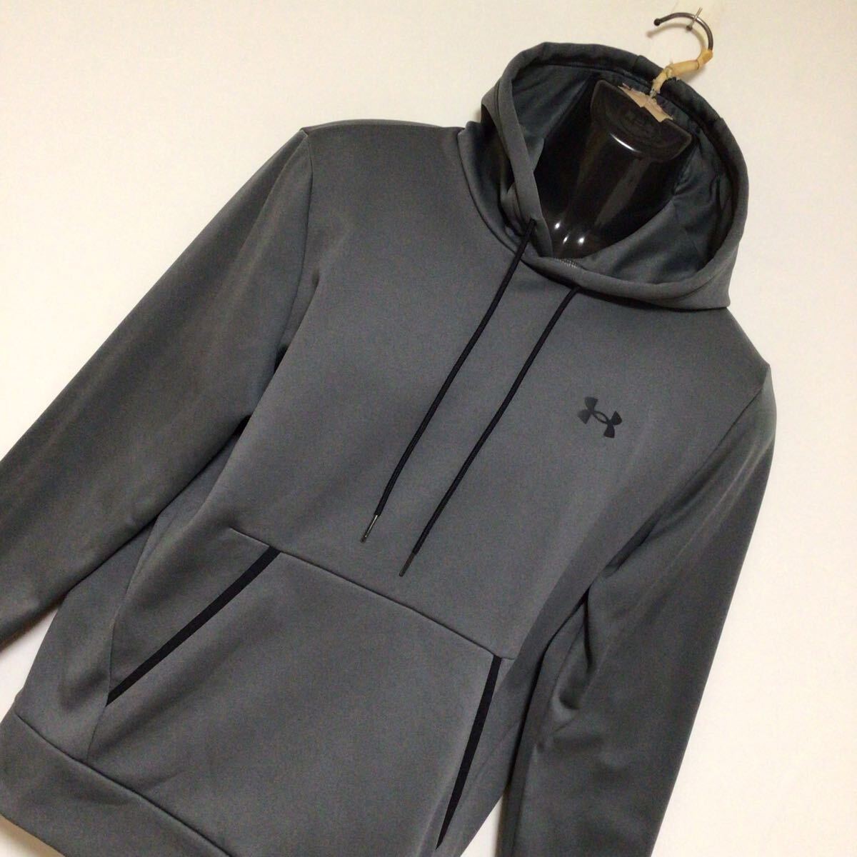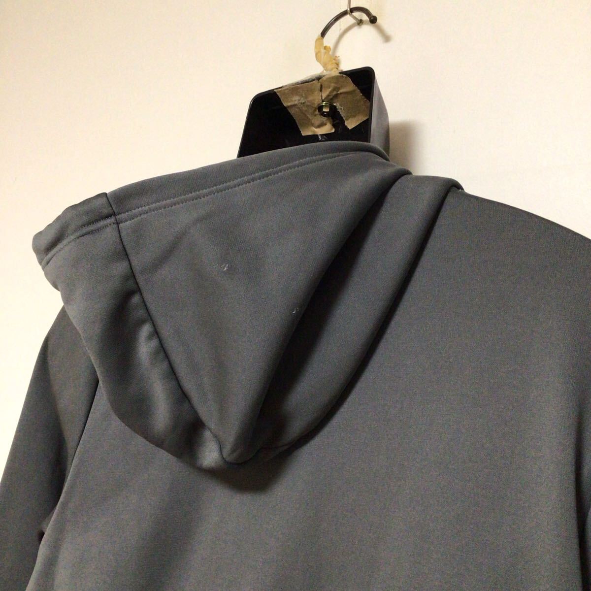 アンダーアンマースウェットパーカーになります。薄手のポリエステル生地、ロゴプリントが施されております。フードに小さな薄汚れ、小キズがございますが目立つ程ではございません。とてもオシャレな作りとなっておりますので是非オススメです。