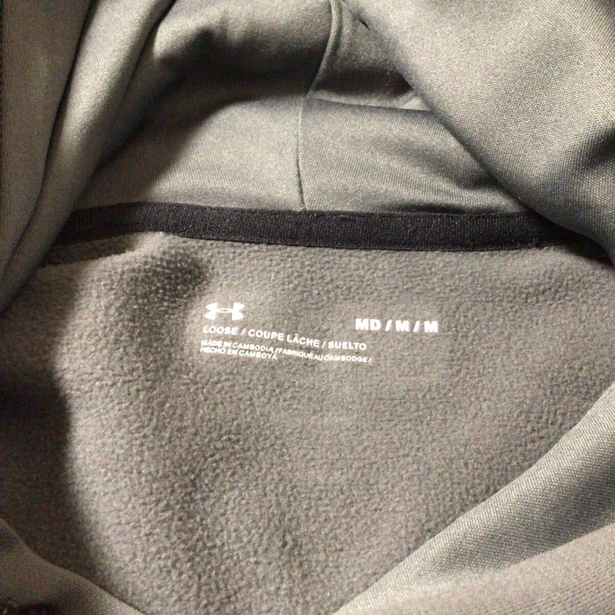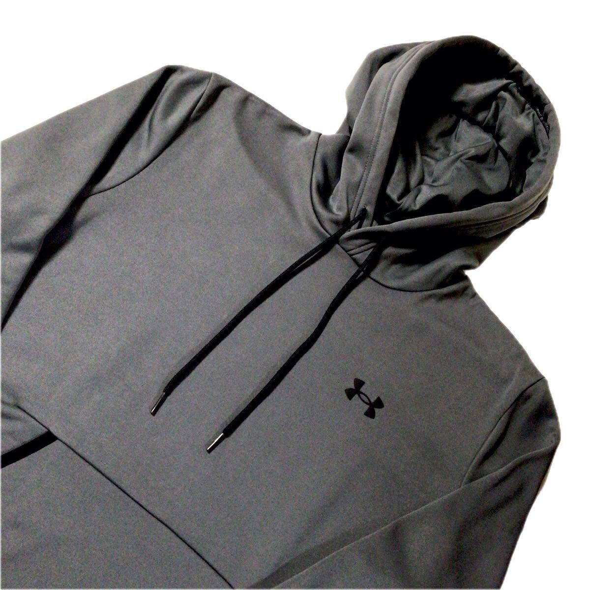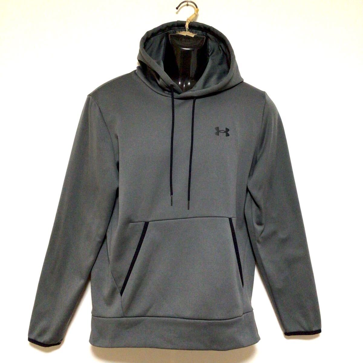 アンダーアンマースウェットパーカーになります。薄手のポリエステル生地、ロゴプリントが施されております。フードに小さな薄汚れ、小キズがございますが目立つ程ではございません。とてもオシャレな作りとなっておりますので是非オススメです。