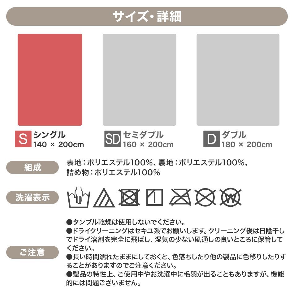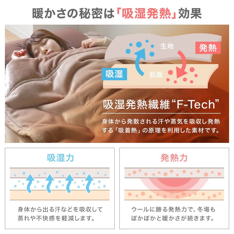 +2℃のあたたかさ! 身体から発散される水分を熱に変える吸湿発熱繊維"F-Tech"を使用。 抗菌防臭効果のあるソフトマイヤー生地を含む3層構造+2枚合わせでしっかり保温! また、丸洗いOKなのでいつでも清潔です。 今年の冬はあったかブランケットでぐっすり気持ちよい睡眠時間を!! 【商品詳細】 サイズ:シングル (約)140×200cm 重量:(約)1.8kg カラー:モカベージュ セットでオススメ あったか敷きパッド(S)はこちら▼ FEF006 あったか敷パッド S 【注意事項】 ・タンブル乾燥は使用しないでください。 ・ドライクリーニングはセキユ系でお願いします。クリーニング後は日陰干しでドライ溶剤を完全に飛ばし、湿気の少ない風通しの良いところに保管してください。 ・長い時間濡れたままにしておくと、色落ちしたり他の製品に色移りしたりすることがありますのでご注意ください。 ・製品の特性上、ご使用中やお洗濯中に羽毛が出る事もありますが、機能的には問題ございません。 ・商品は、モニターによって色合いが異なって見える場合があります。 |