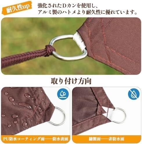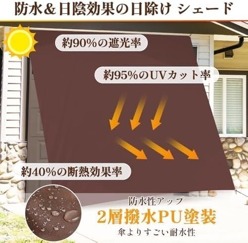 • 【高品質素材、長期間の信頼】弊社の防水シェードは、高品質の400Dポリエステル素材を採用しており、より高い繊維密度を有し、さらに高い引き裂き抵抗性と耐候性を発揮します。販の一般的300D材質と比較すると、素材を大幅に改良されて、さらに高い耐久性を備え、裂けにくさを大幅に向上させています。長期間の使用や強力な外力にも耐えられ、破損のリスクを最小限に抑えられます。耐久性と強度を求めるお客様に最適な選択です。