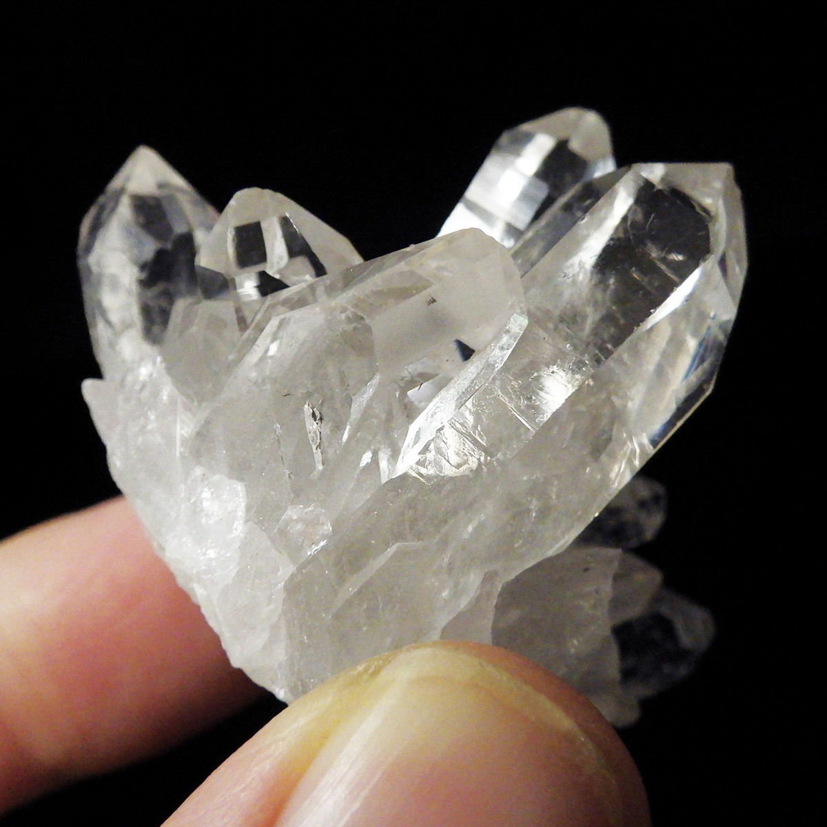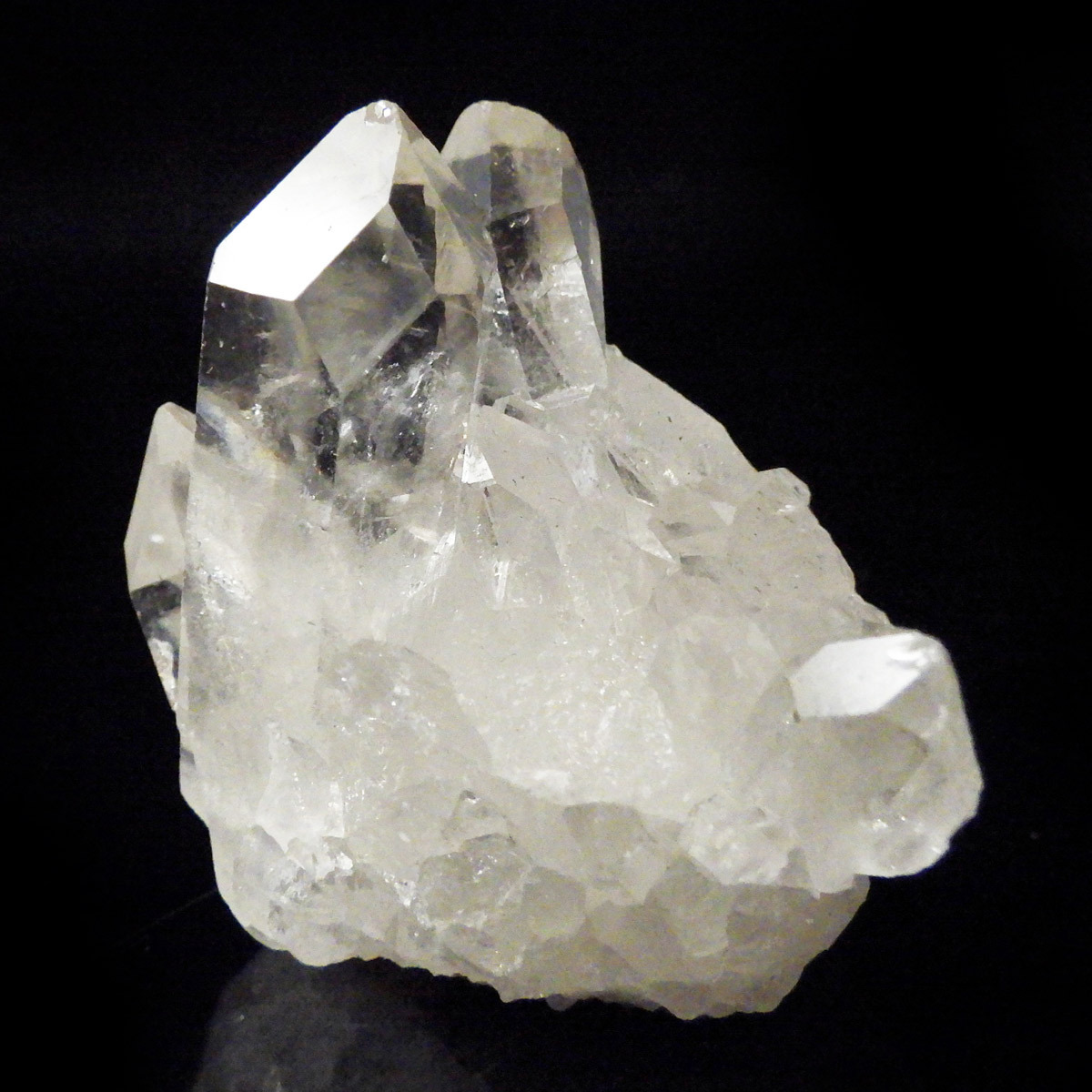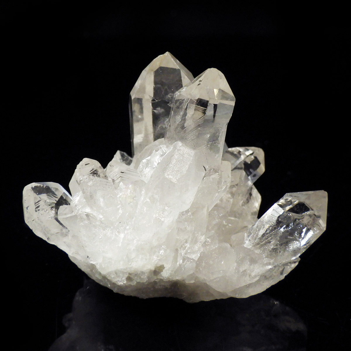 ブラジル トマスゴンサガ産 の水晶クラスターです。トマスゴンサガ産の水晶の特徴は、照りと艶。光沢が強いため、驚くほどキラキラとしています。また、水晶柱が放射線状に伸びて立体的な構造を作っているものが多く、「これぞ、水晶クラスター」という形状をしています。非常に透明度の高い大小様々な結晶が複雑に絡み合い、見る角度によって様々な表情を見せる大変美しいクラスターです。