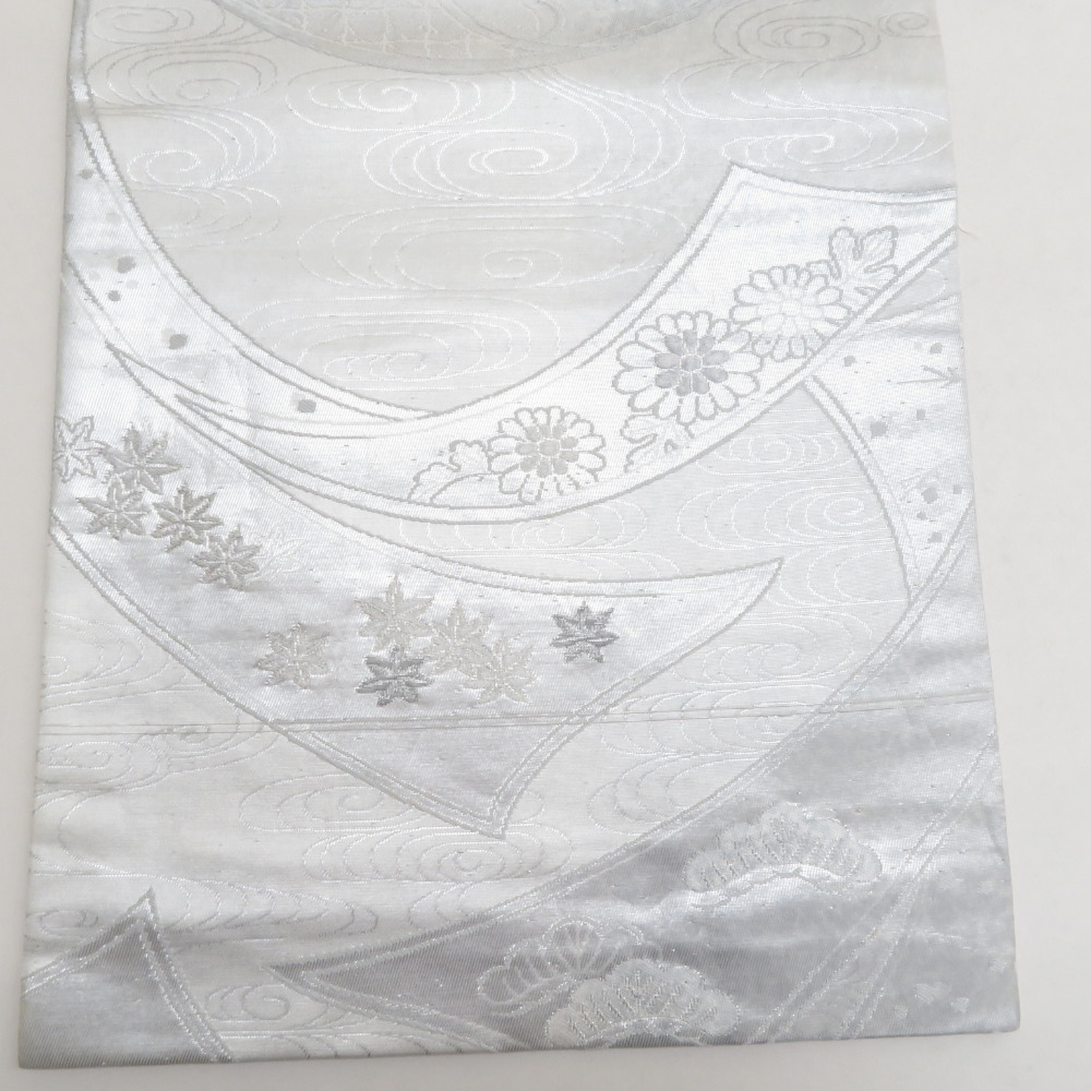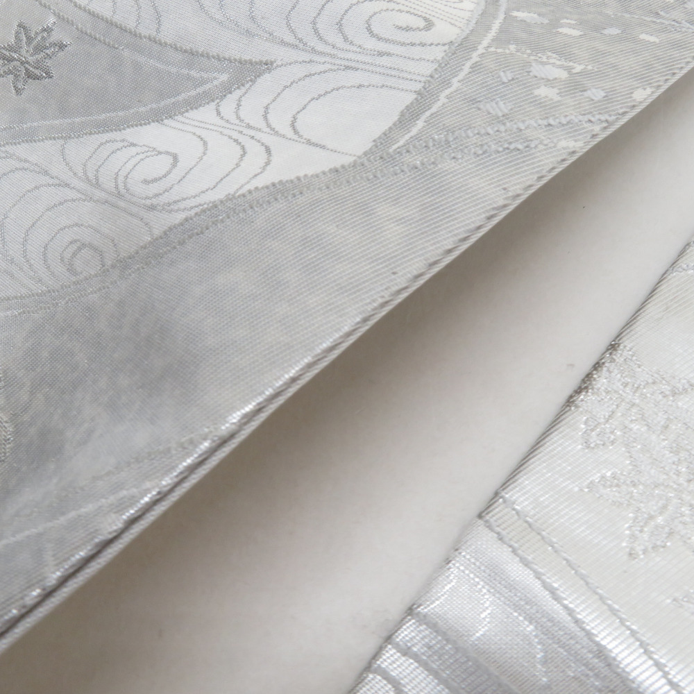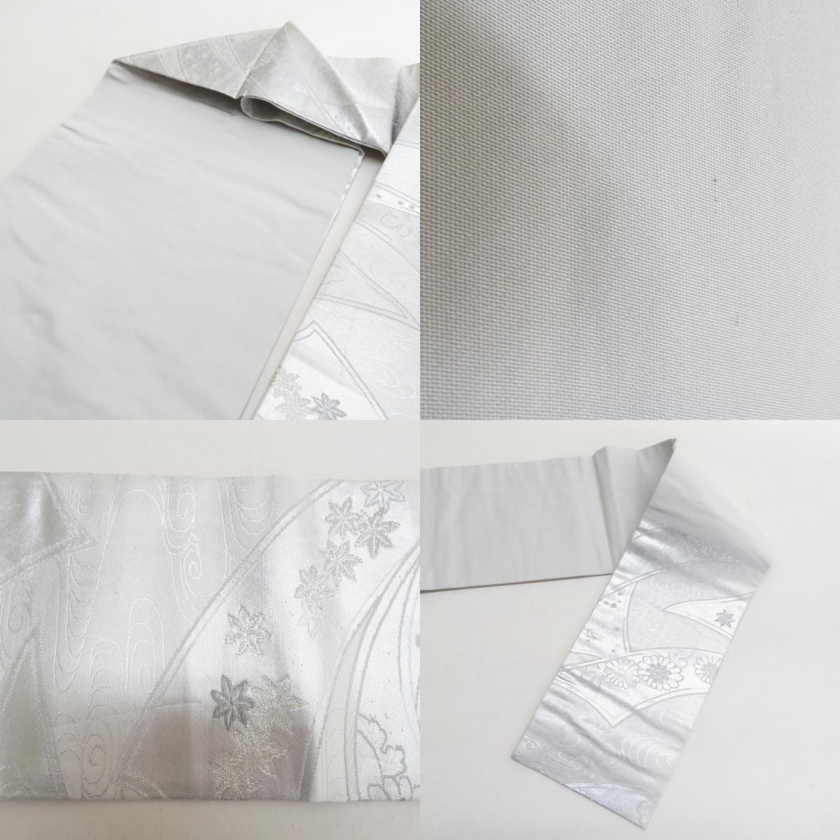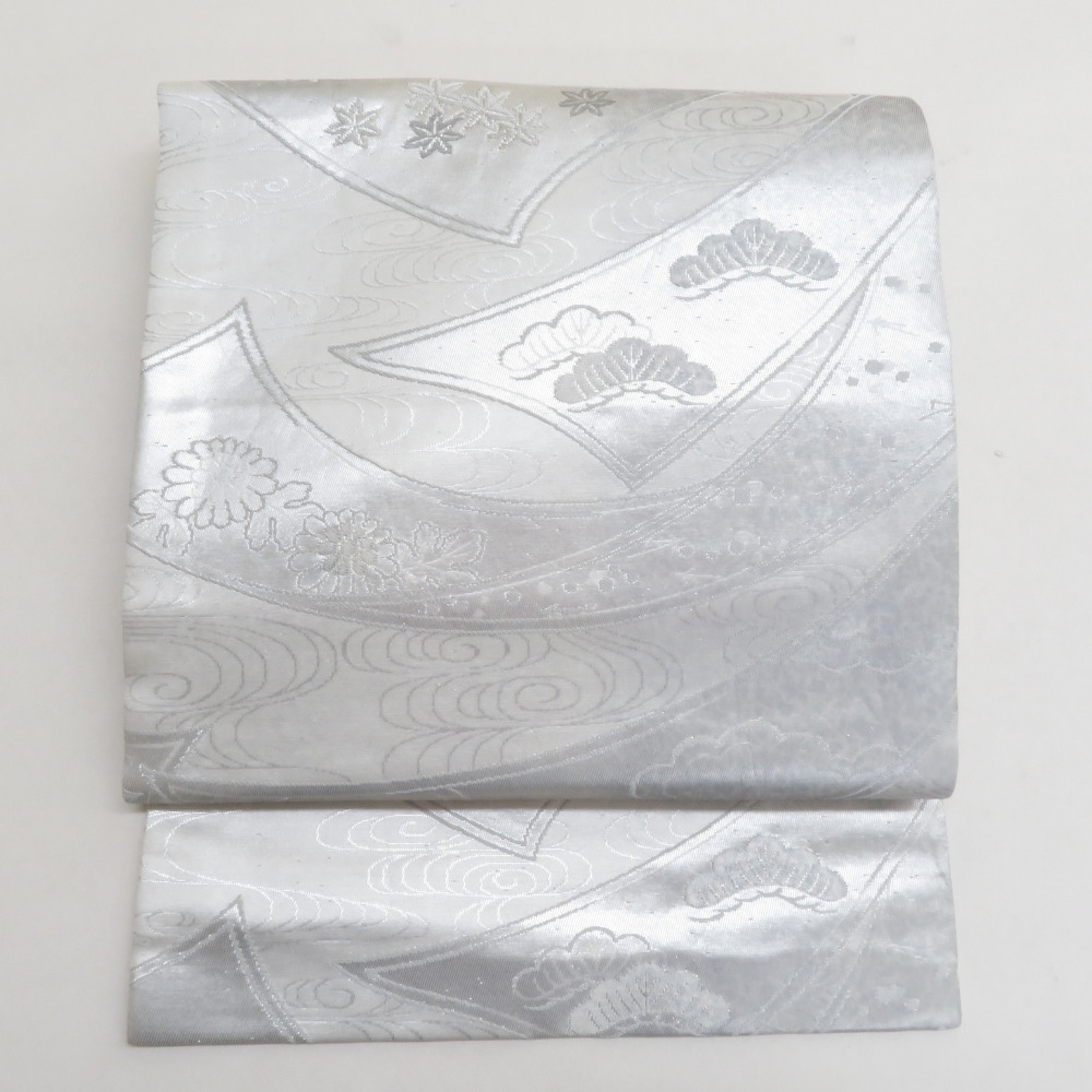| 名古屋帯 正絹 シルバー系 銀糸 熨斗に流水など 六通柄 セミフォーマル 仕立て上がり 着物帯 長さ355cm |