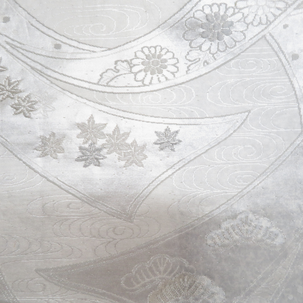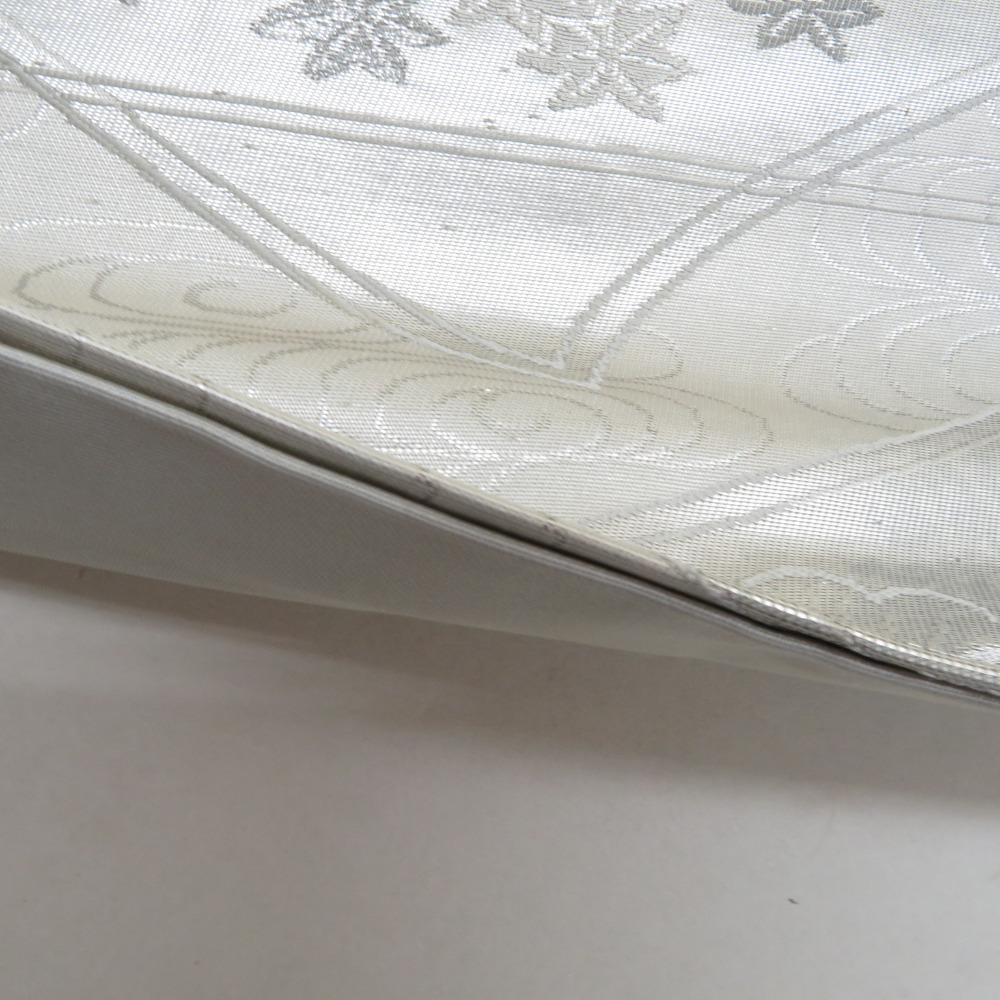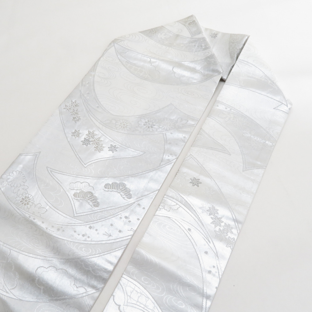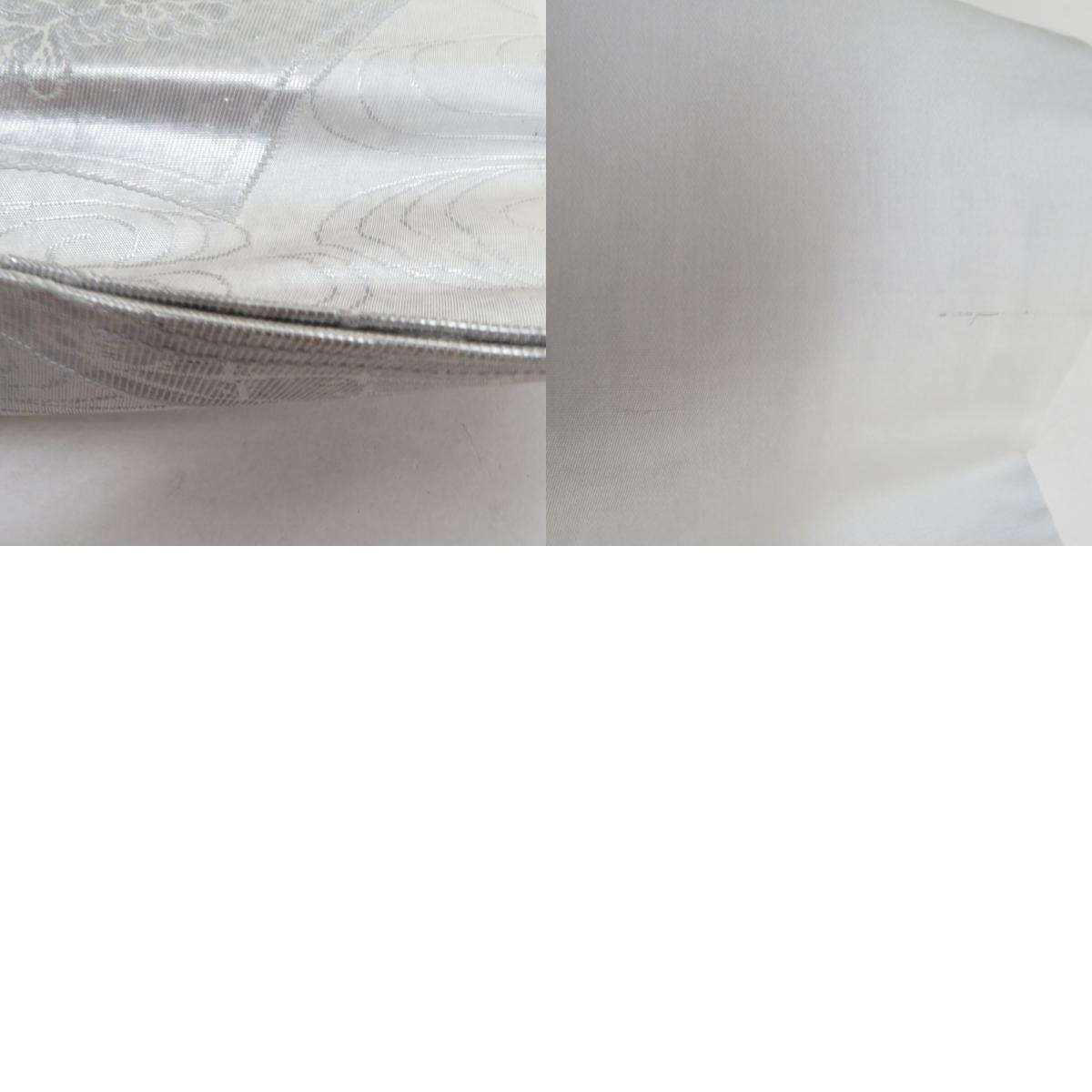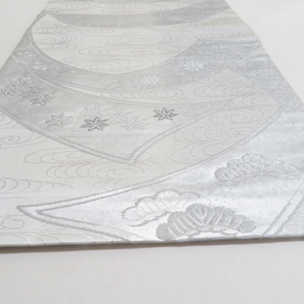 | 名古屋帯 正絹 シルバー系 銀糸 熨斗に流水など 六通柄 セミフォーマル 仕立て上がり 着物帯 長さ355cm |