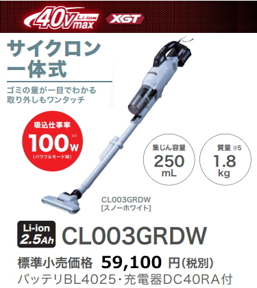 マキタ 充電式クリーナ CL003GRDW 白【40V-2.5Ah】