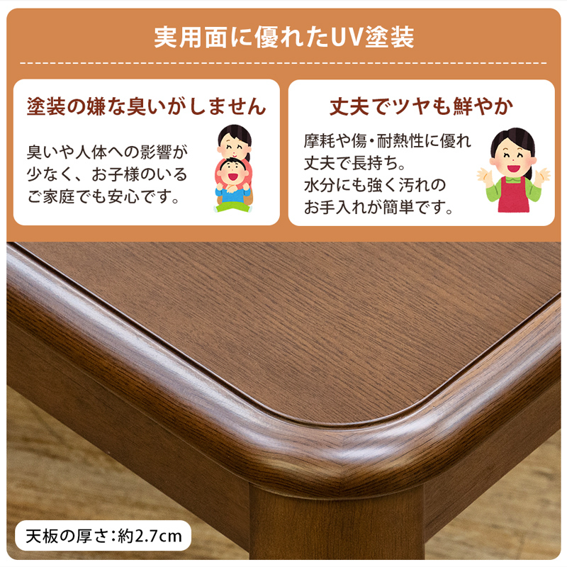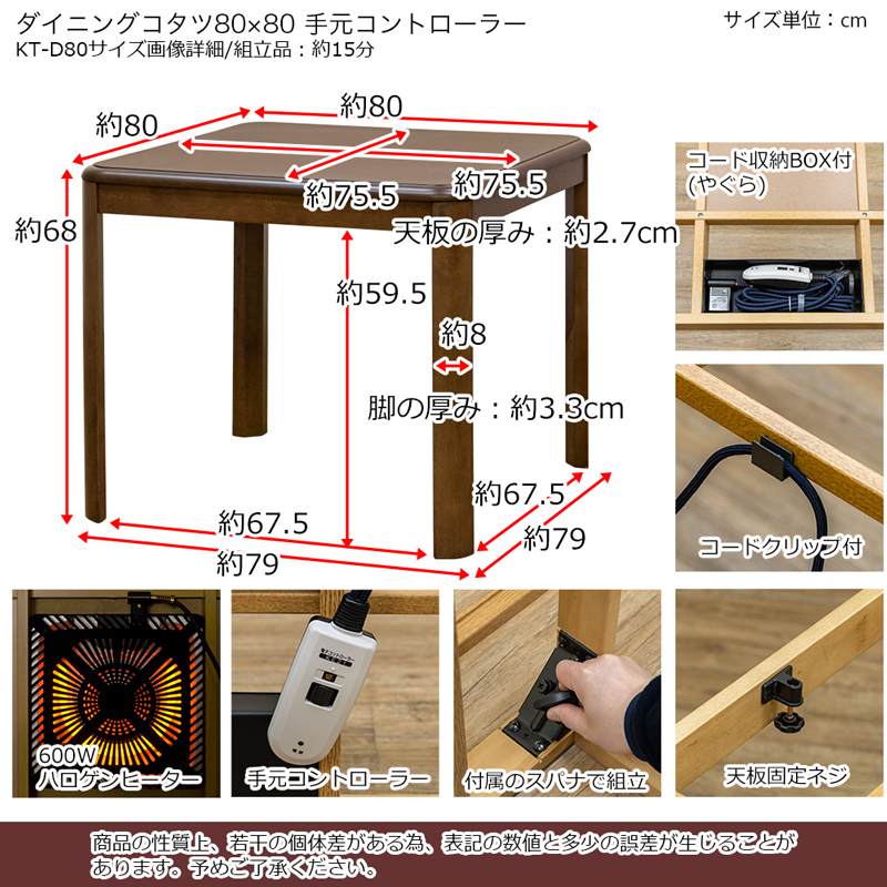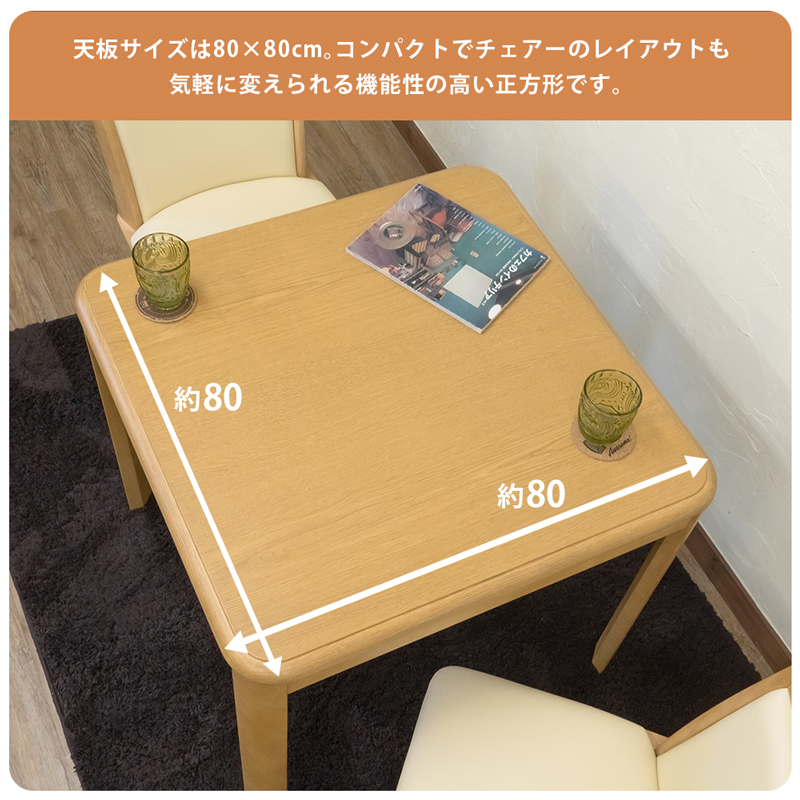 | サイズ(コタツ) | (W)幅80×(D)奥行80×(H)高さ68cm 天板厚:約27mm 脚幅:約80mm(厚み:約33mm) |