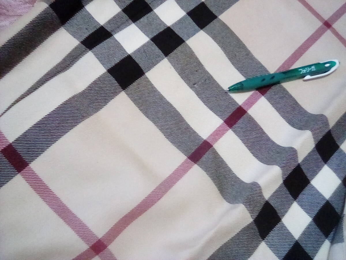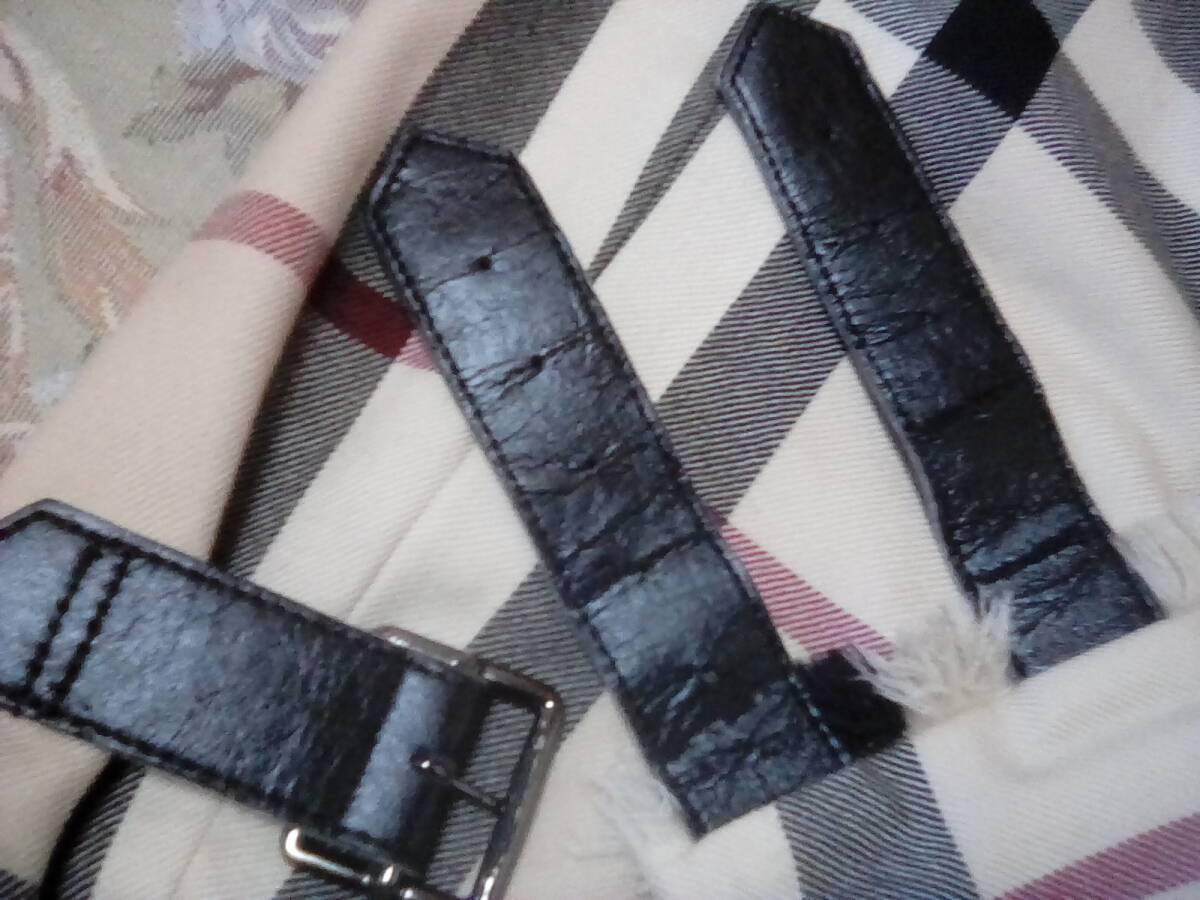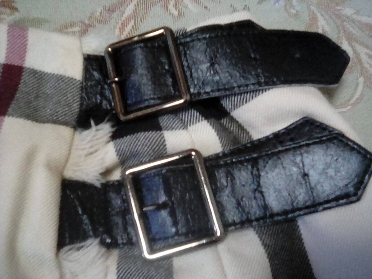 革のバックル付きですがかなりのダメージあり、見方によっては、風合いも感じられます。又、かなりの箇所穴あきがあります、裏地つきのためカバーできますが、バーバリー柄が好きな方は普段使いにどうぞ、他のものにリメイク もお勧めです。