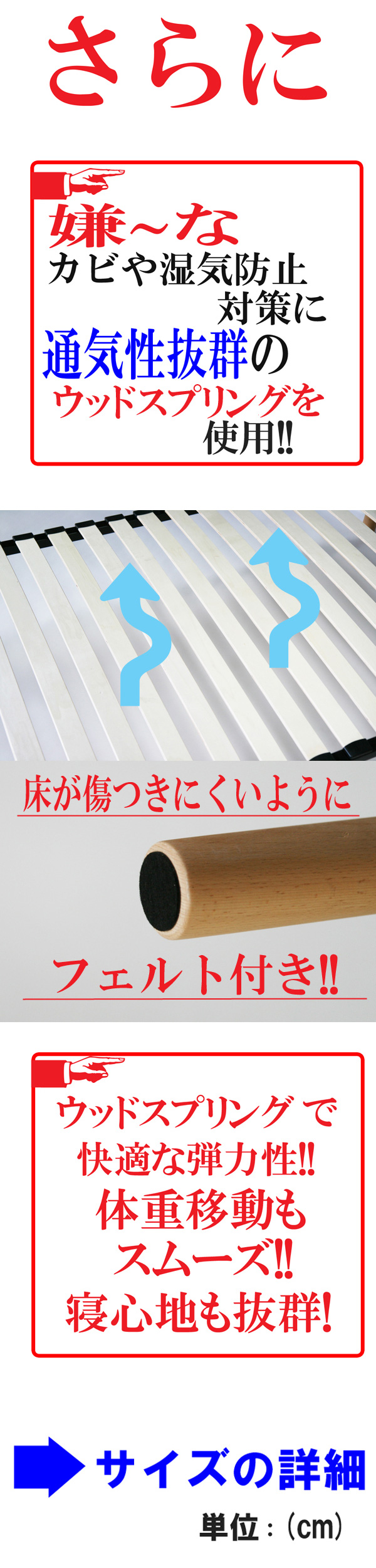 ○大人気のベッドシリーズ!! ●体重移動もスムーズにできる、ウッドスプリングを使用!!。 ○適度な弾力性で 寝心地も抜群!!。 ●ウッドスラットの厚みは、約9mm!! ○しっかりした安定感で 快適ライフ。 ※こちらの商品は、組み立て式です。 |