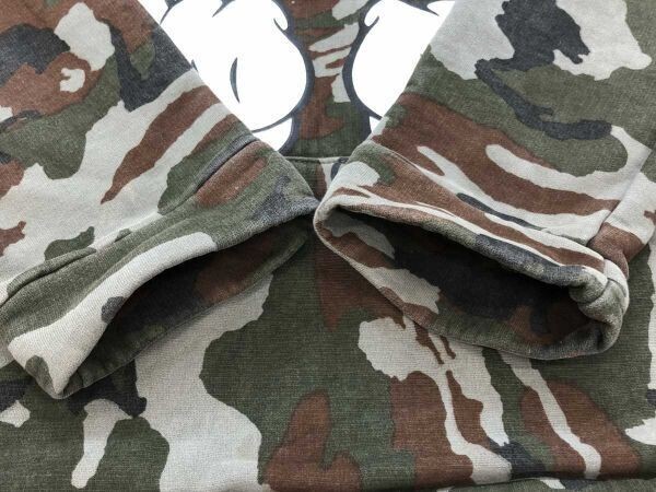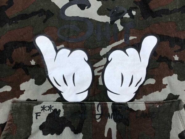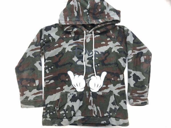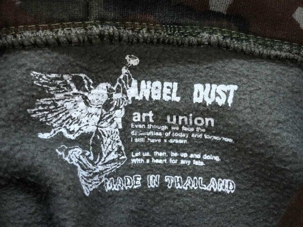 ANGEL DUST ART UNION タイ製 ミッキーハンド ストリート パロディ 迷彩カモフラ スウェット パーカー メンズ フロントプリント カーキです。