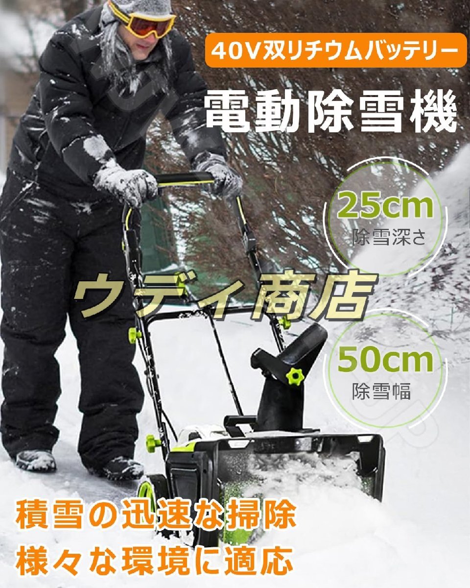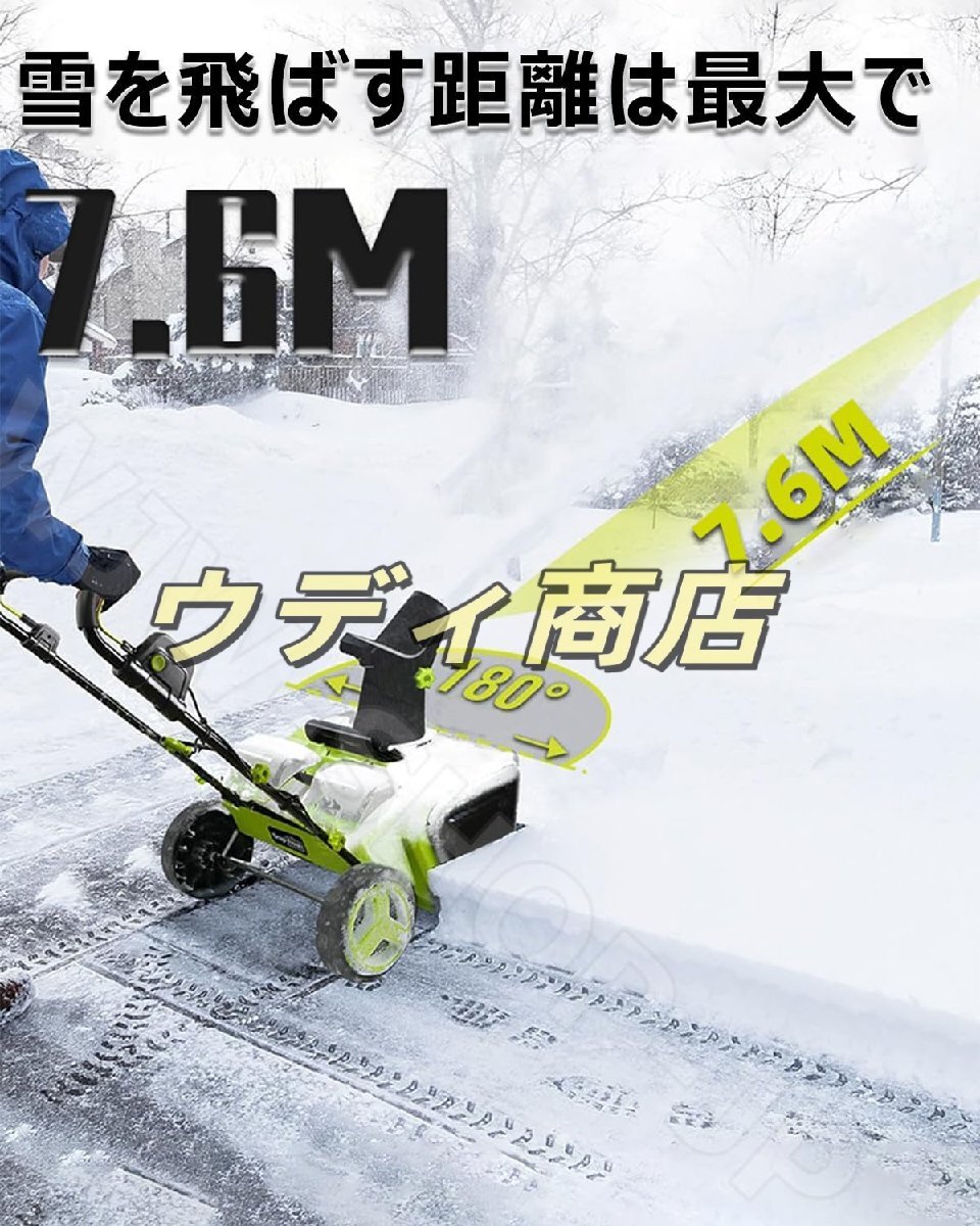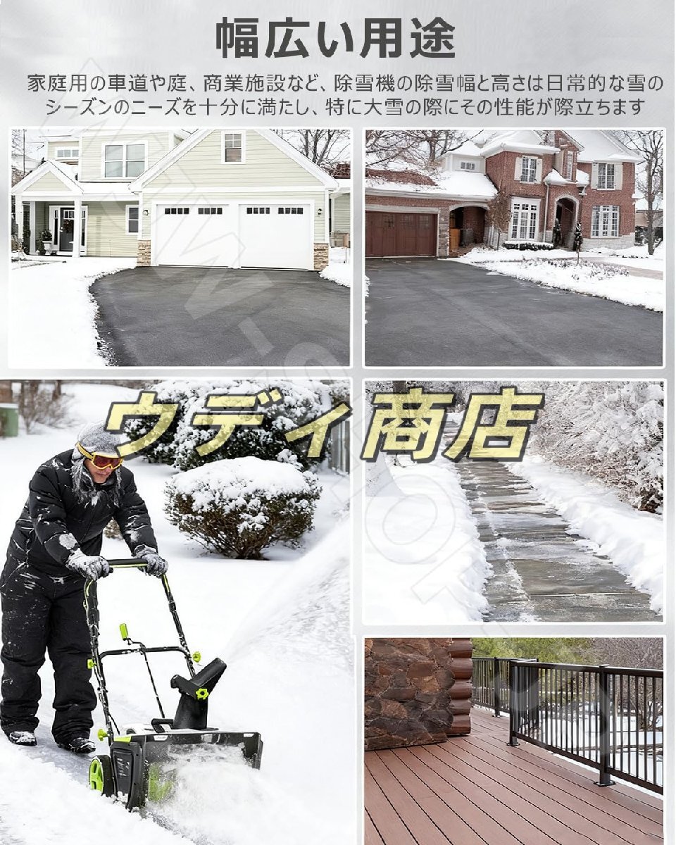 【大容量リチウムバッテリー、強力でクリーン】充電式リチウムバッテリーを搭載し、3500W の強力な出力を発揮。バッテリー 1 回の充電で長時間使用可能で、ガソリン不要なのでクリーンに使用。ガソリン駆動式より低騒音で環境に優しく、大容量バッテリーなので広範囲の除雪作業にも対応。家庭用から小規模商業施設まで幅広いニーズを満たします。