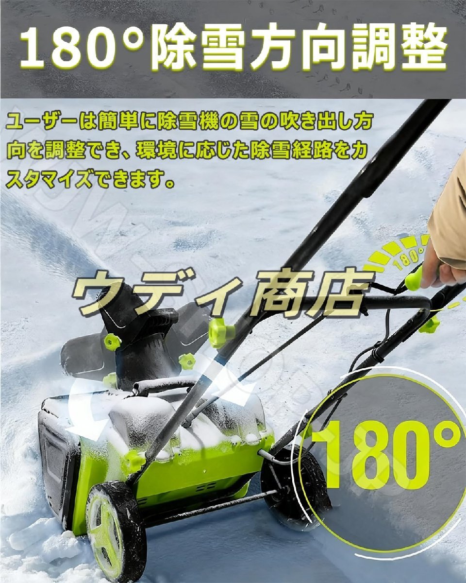 【180° 自在調整、吹雪方向柔軟操作】この電動除雪機は、180° の吹雪方向調整機能を搭載。除雪した雪を簡単に指定場所へ飛ばせ、手動での方向調整の手間を省き、作業がスムーズに。電動除雪機ならではの操作性で、除雪機を何度も移動することなく正確に雪を飛ばせ、家庭用除雪機として非常に便利です。