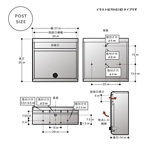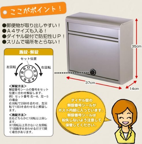 ダイヤル錠・チタングレー FH-614D(TGY)・・Color:チタングレーStyle:ダイヤル錠・サイズ:(約)幅37.0×奥行14.0×高さ35.0cm・重量:2.1kg・素材・材質:亜鉛メッキ鋼板(アクリル樹脂焼付塗装)・製造国:日本・付属品:ネジ×4、ネーマー×1、シール×4商品紹介 A4封筒がラクラク入るスリムタイプ。 ダイヤル錠付きなので投函物の盗難防止。 投函口サイズ:幅34.5×高さ5cm。 より ●奥行が14cmの薄型タイプ。ダイヤル錠付で防犯性UP!
