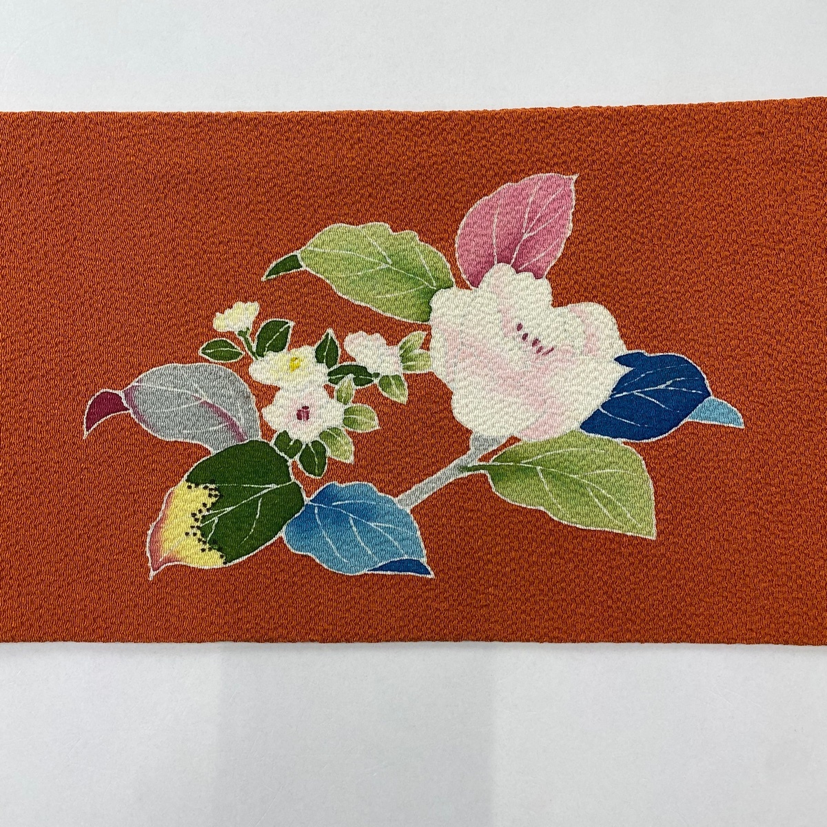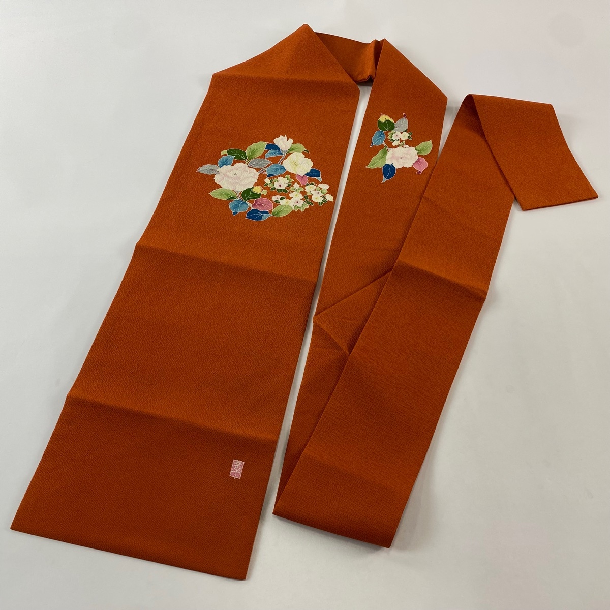 | 名古屋帯 秀品 落款 椿 枝花 縮緬 オレンジ 正絹 【中古】 |