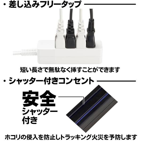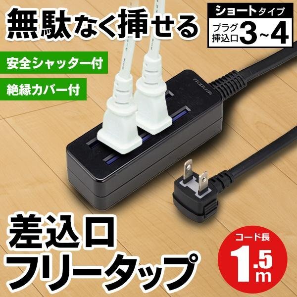 延長コード 3~4個口 スペース削減 電源タップ 1.5m 差込口フリー 安全シャッター付 コンセント 新生活 送料無料 7M◇ 無駄なくショート:黒