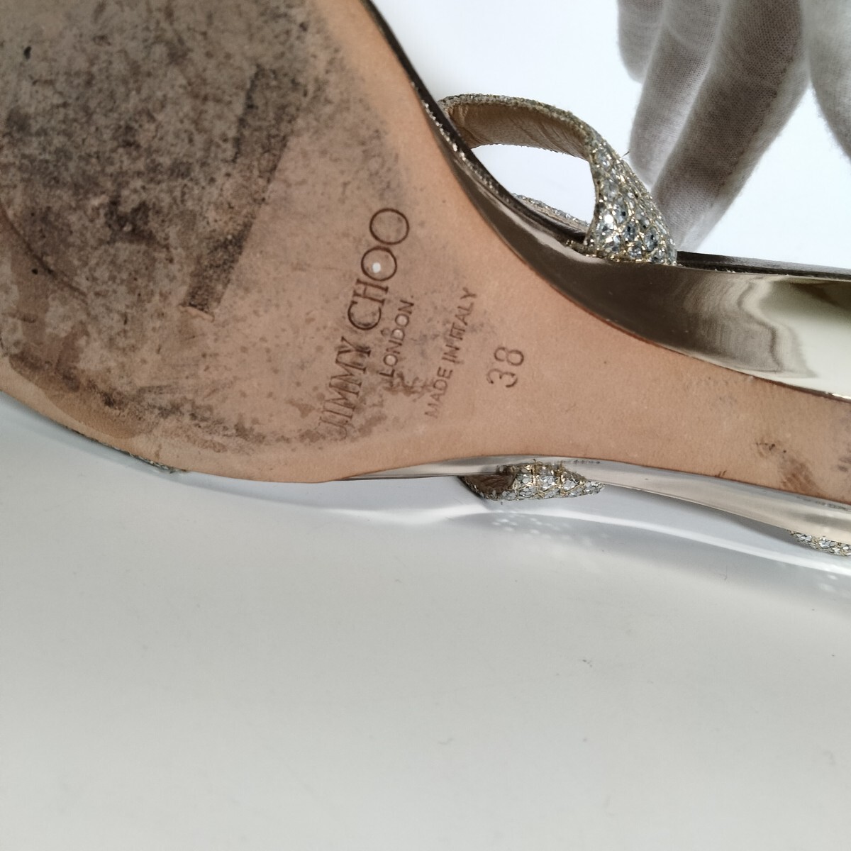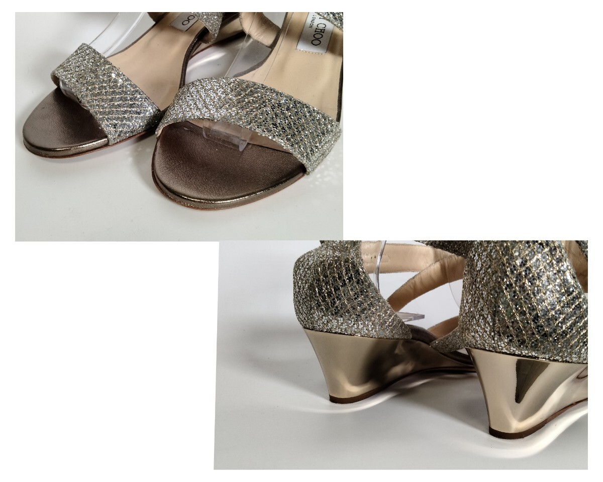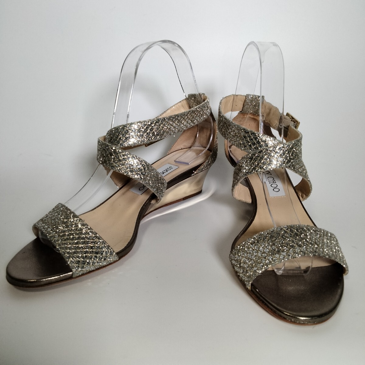 足元を華やかに彩る、JIMMY CHOO ジミーチュウ グリッター ウェッジソール サンダルです。