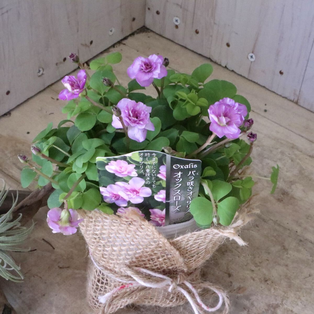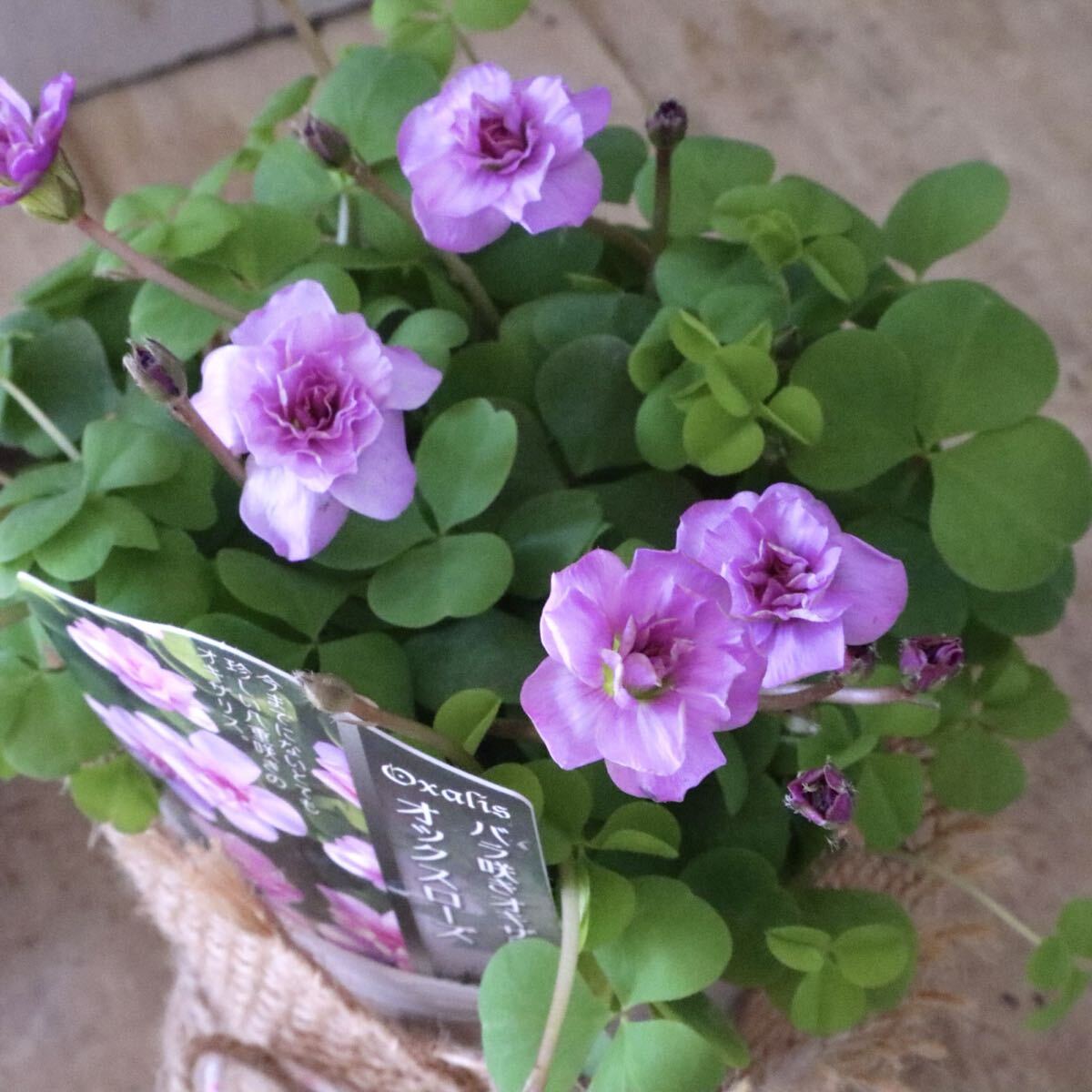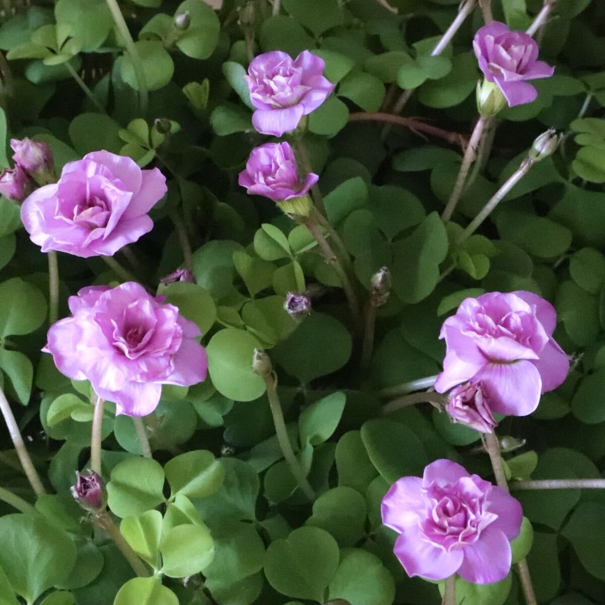 一般的なオキザリスは、朝、晩は花を閉じますが、八重の花なので花が閉じることなく咲いています。