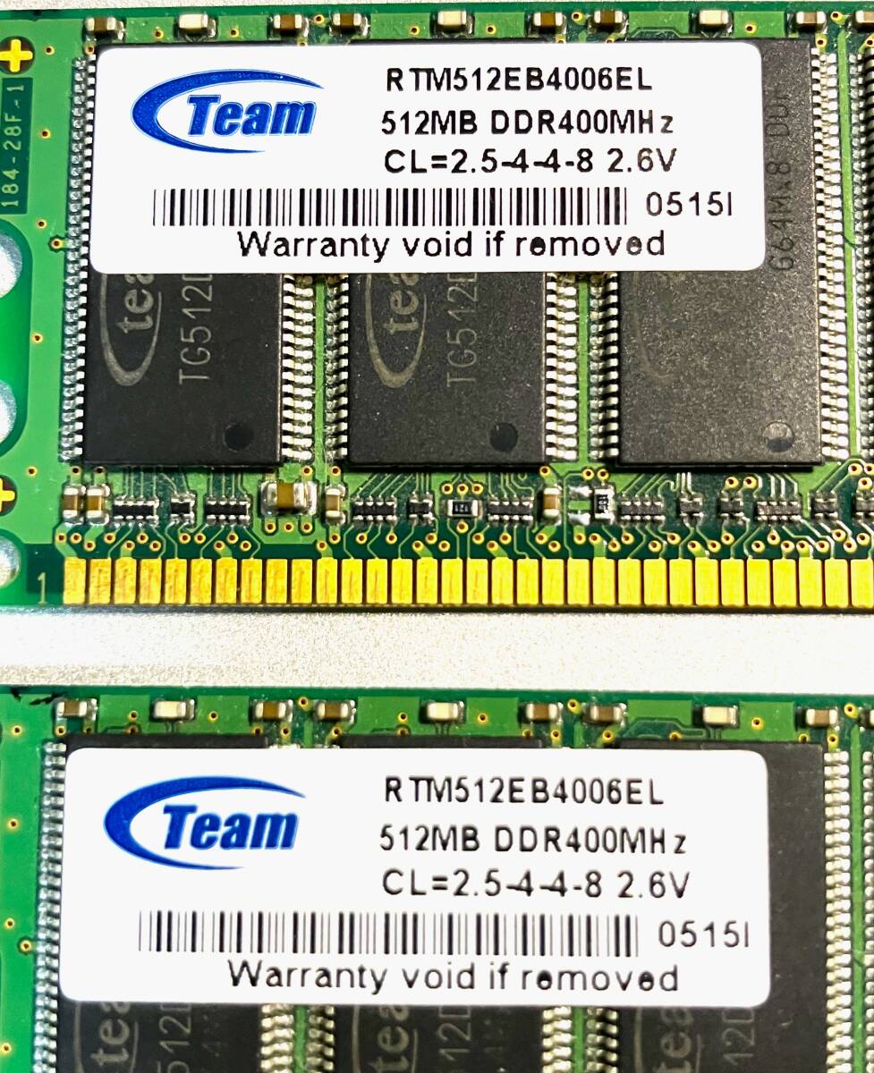 デスクトップPC用メモリー 512MB×2枚 DDR SDRAM Team製 RTM 512EB4006EL 中古