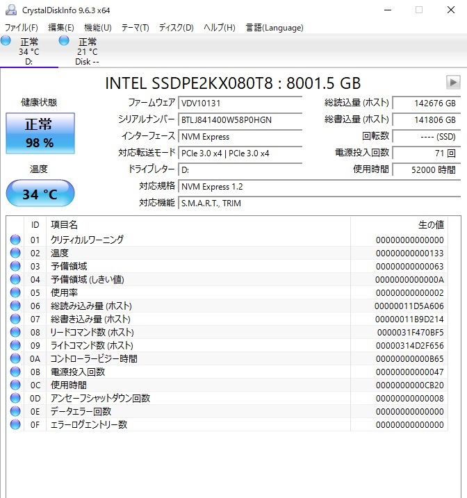 その11 Intel SSD DC P4510 SERIES 8TB 使用52000時間 電源71回 NVMe 2.5 U.2 中古 送料込み
