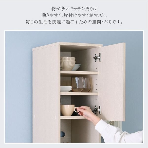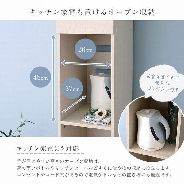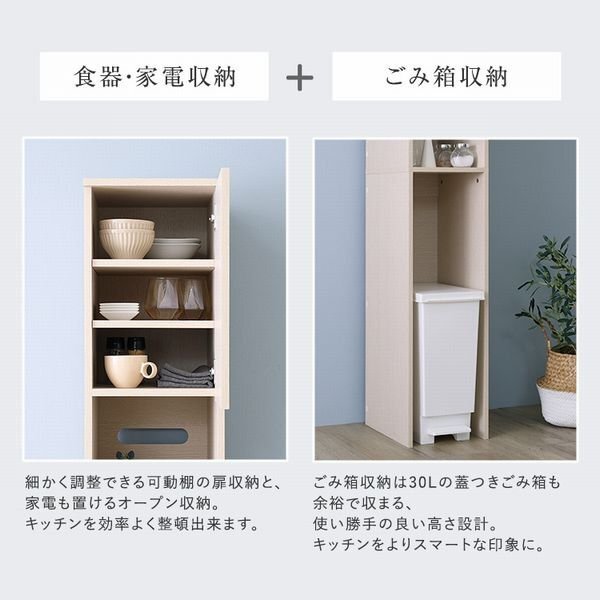 | さわやかな木製ごみ箱上ラック すき間収納タイプ 中途半端なすき間をピッタリ埋めてくれるスリムなゴミ箱上食器棚です。 一般的な30Lのゴミ箱を1台収納することができます。 上部は扉収納とオープン収納がある為、食器や家電などをスマートに収納できます。 |