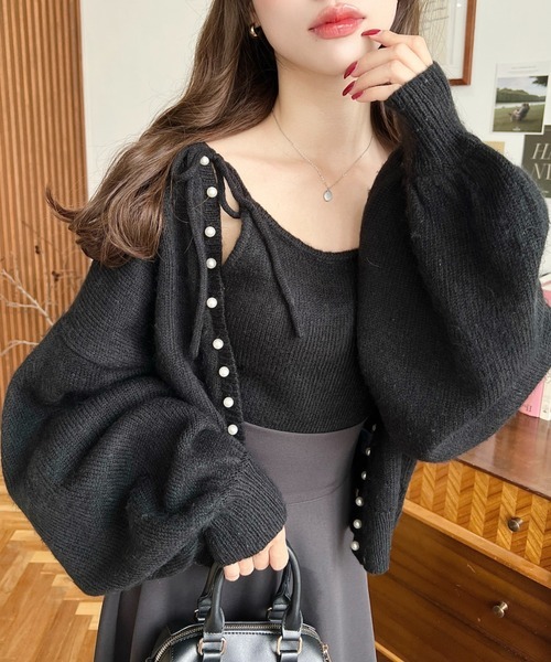 参考商品名:パール付きニットカーディガン&リボン付きニットキャミソールアンサンブル