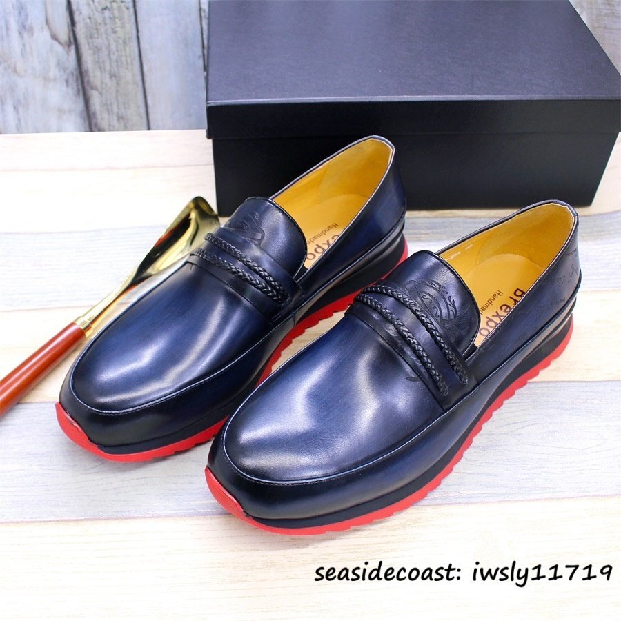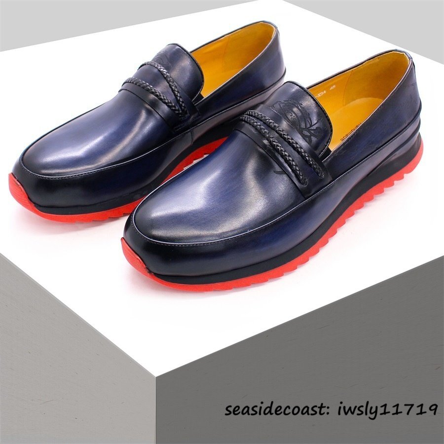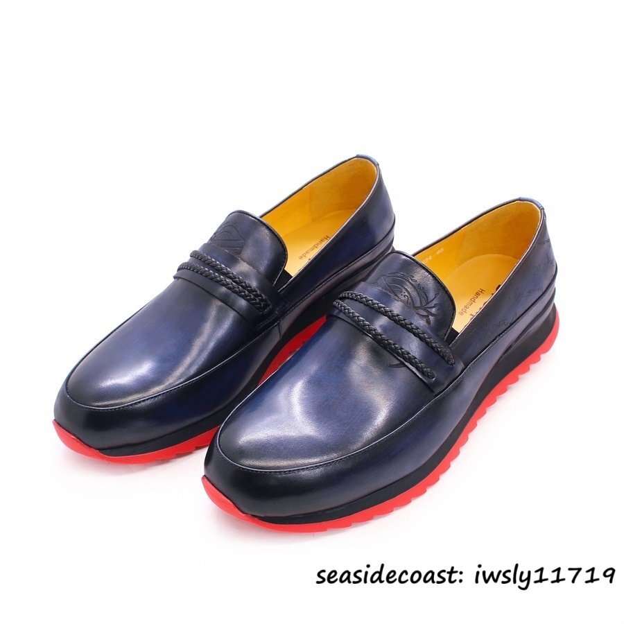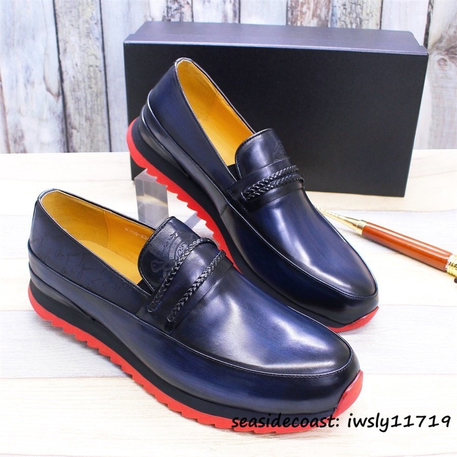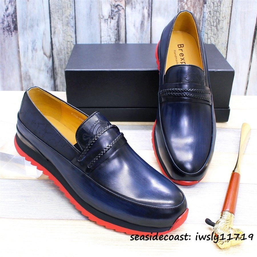 定価9万超◆最高級 ローファー メンズ 本革レザーシューズ ビジネスシューズ 牛革革靴 職人手作り 紳士靴 軽量 スリッポン ブルー 25.5cm