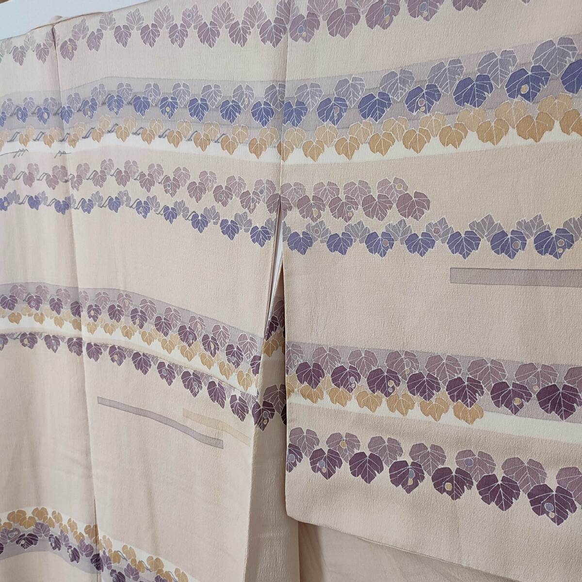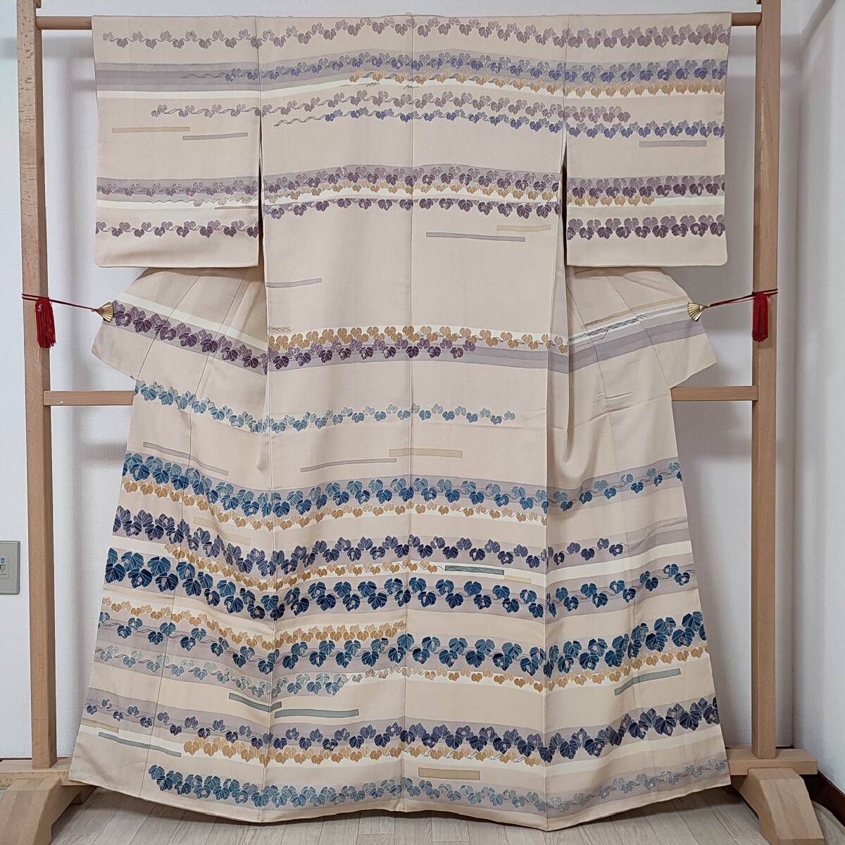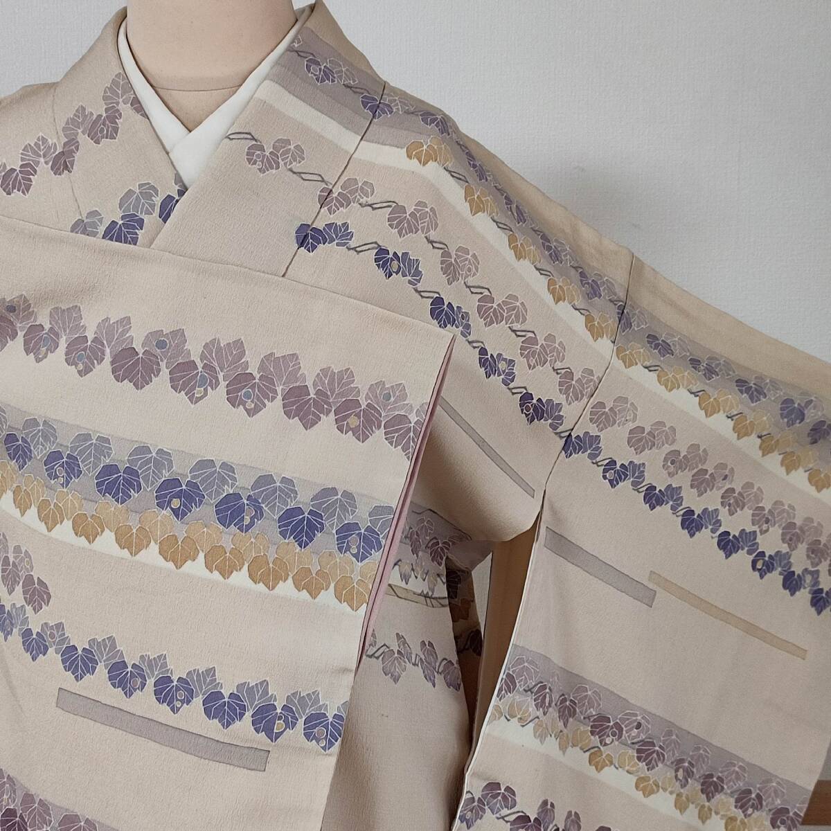 即決■着物の越田■裄65身丈165.5 正絹 付下げ 袷 葉 蔦 ベージュ系■も05E03